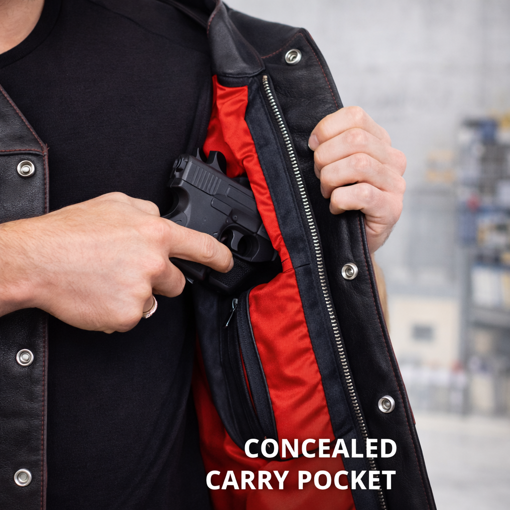 Mens Leather Motorcycle Club Vest Concealed Carry Biker Snap Zip