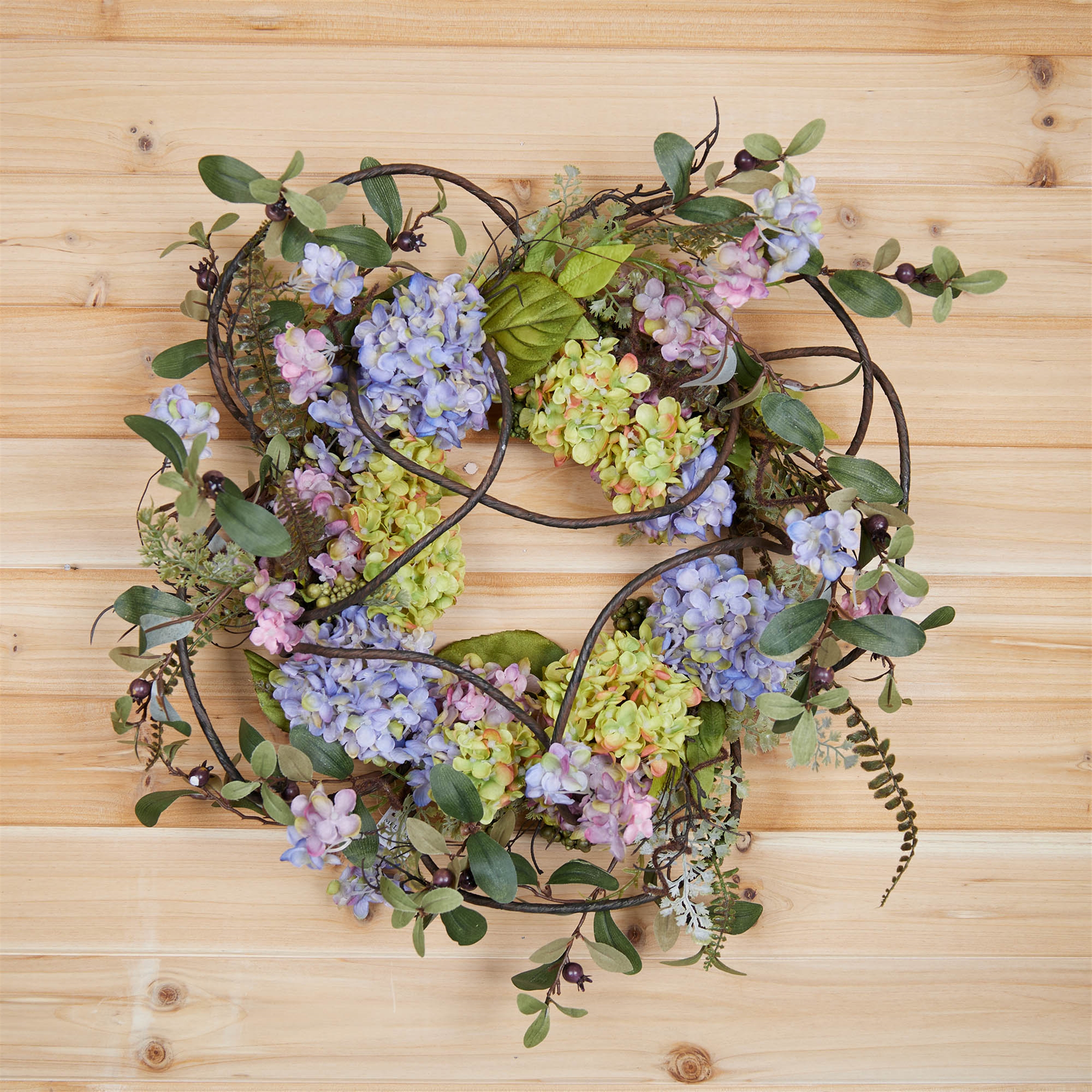 Welcome guests with the beauty of nature year-round with our Hydrangea Floral Wreath. Featuring stunning shades of purple and pink, this 22-inch wreath is made from durable, high-quality cloth flowers and variegated foliage. The lush greenery and intricate design bring a refreshing touch of color and elegance to any indoor or outdoor covered space. With its sturdy twig base, this wreath is built to last for many seasons, making it a timeless addition to your home decor. Hang it on your front door or in your entryway for a warm and stylish greeting that sets the tone for every season. Measures 22 inches across when branches are extended and fluffed.