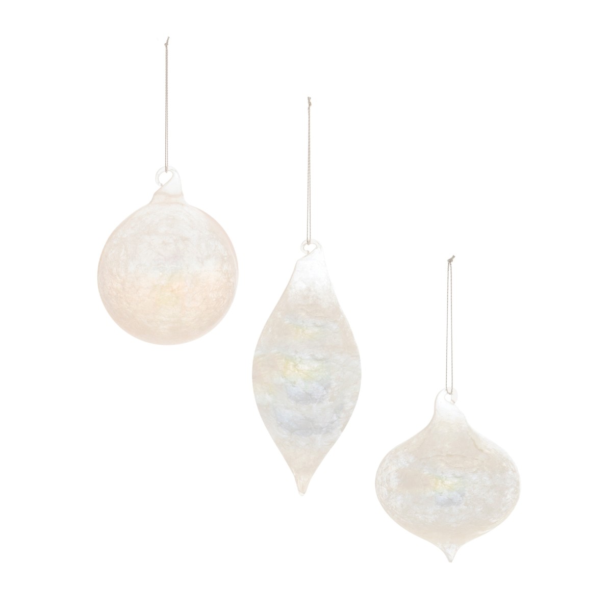 Enhance your holiday decor with the ethereal beauty of these Iridescent Cloudy Glass Ornaments. Featuring soft gray, white, and ivory tones, these ornaments showcase a chic iridescent finish and a delicate cloudy design that adds an airy, modern feel to your seasonal display. The set includes three assorted designs classic ball, elegant onion, and a unique shape each with a swirled glass ornament cap and delicate string hanger. Perfect for your Christmas tree, wreaths, or garlands, these ornaments bring a sophisticated, wintry touch to any space.