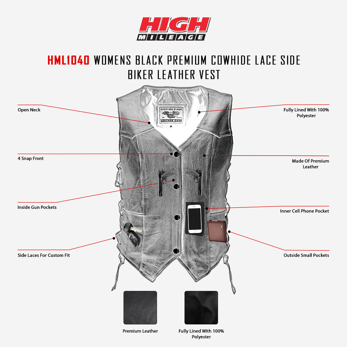 • 1 Zippered pocket on the right side of the inside and a cell phone or small pocket on the left side