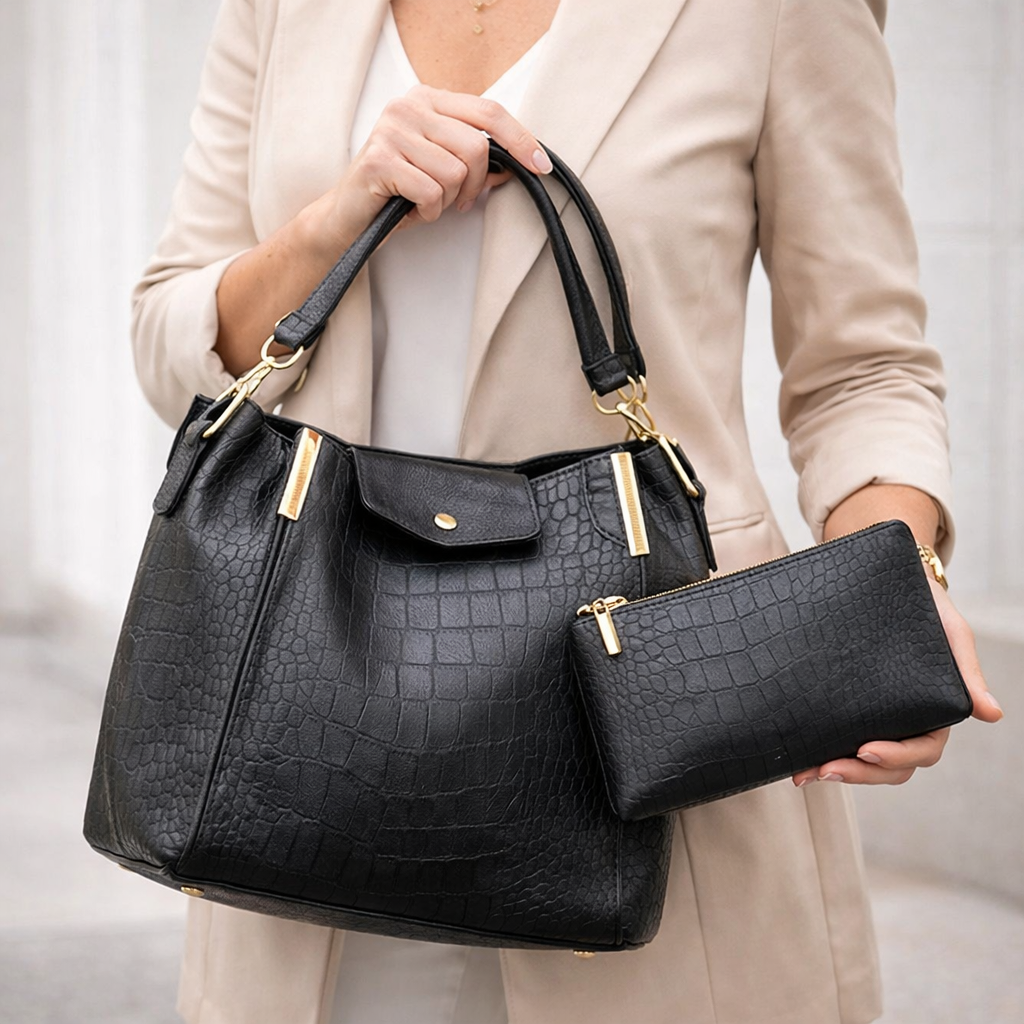Black color faux leather. It fits both formal and casual environments. Our expert craftsmanship with sleek design makes this handbag your go-to bag whether you are going to work or on a short run to the mall. Multiple pockets keep your essentials organized. Use the top handles or attach the shoulder strap to suit your carrying preferences.