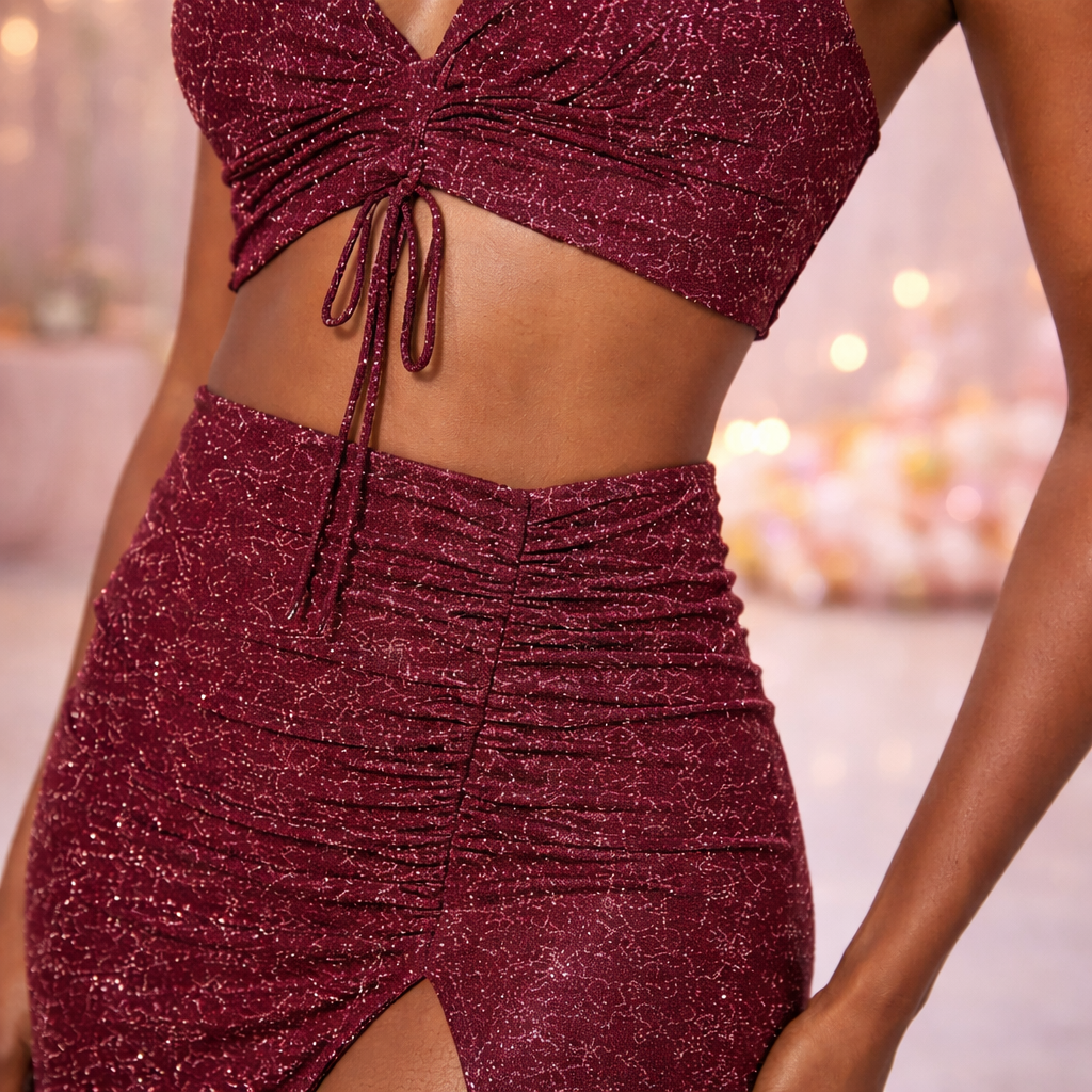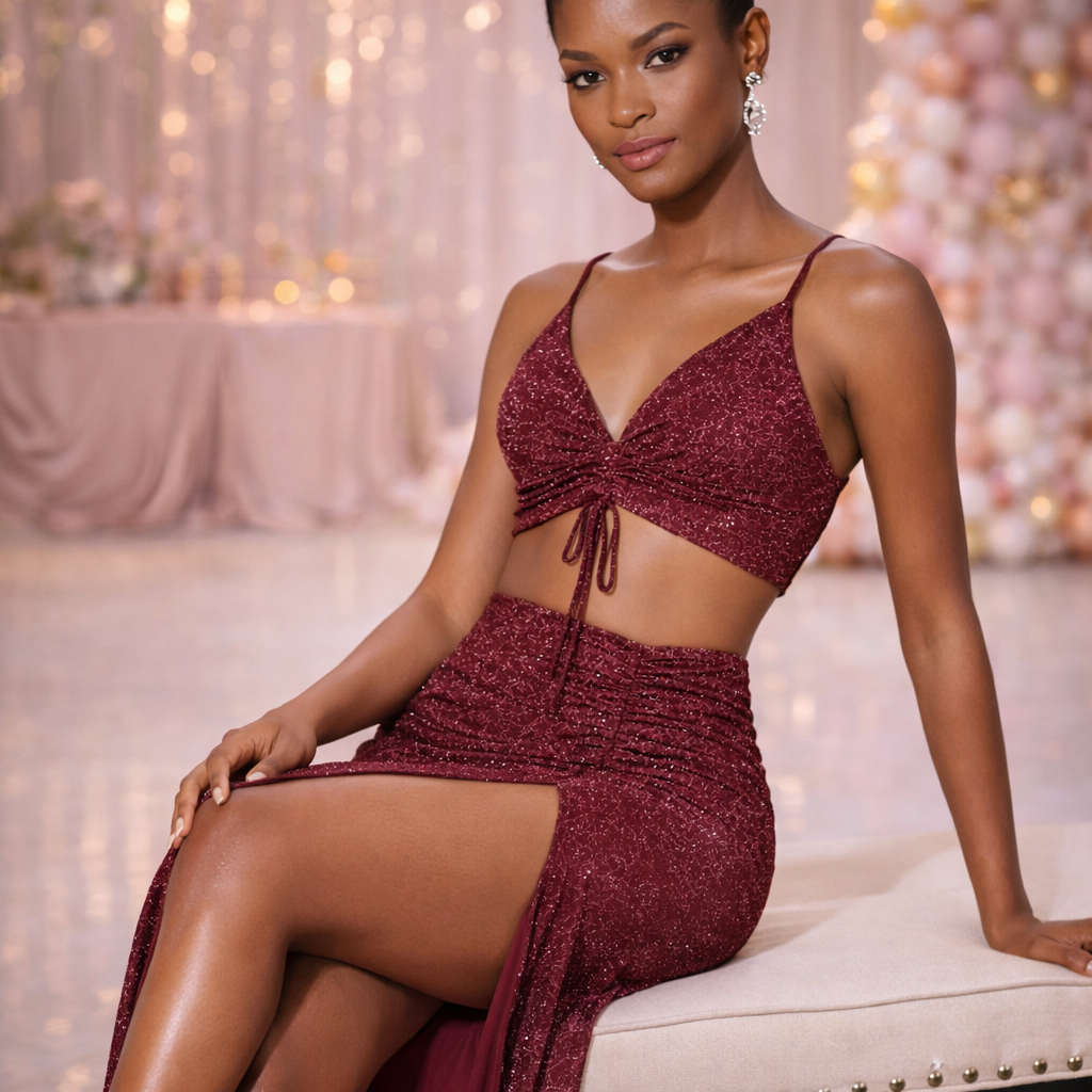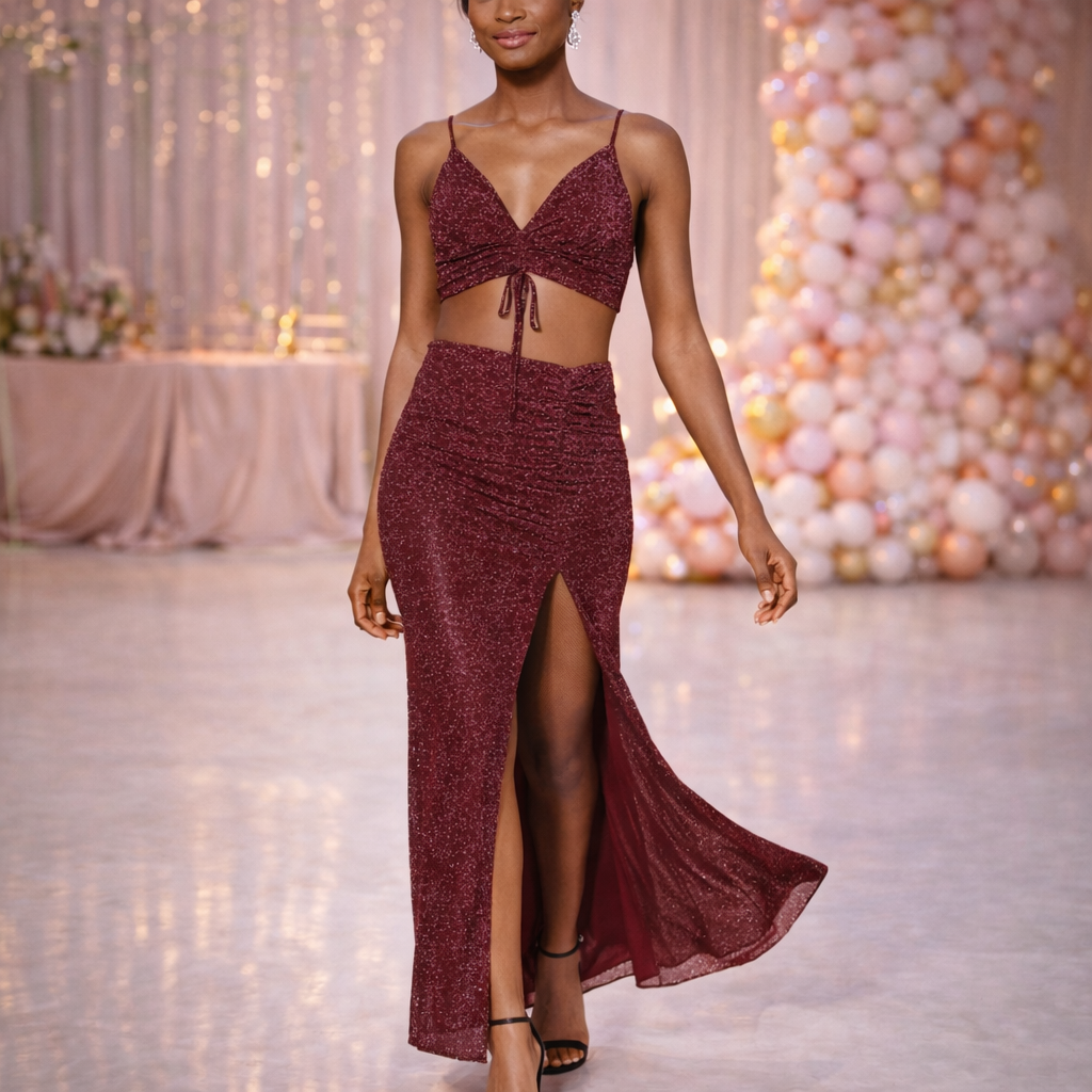 Turn heads at prom, homecoming, or your next formal event in this stunning wine glitter 2-piece set by Xtraordinary.