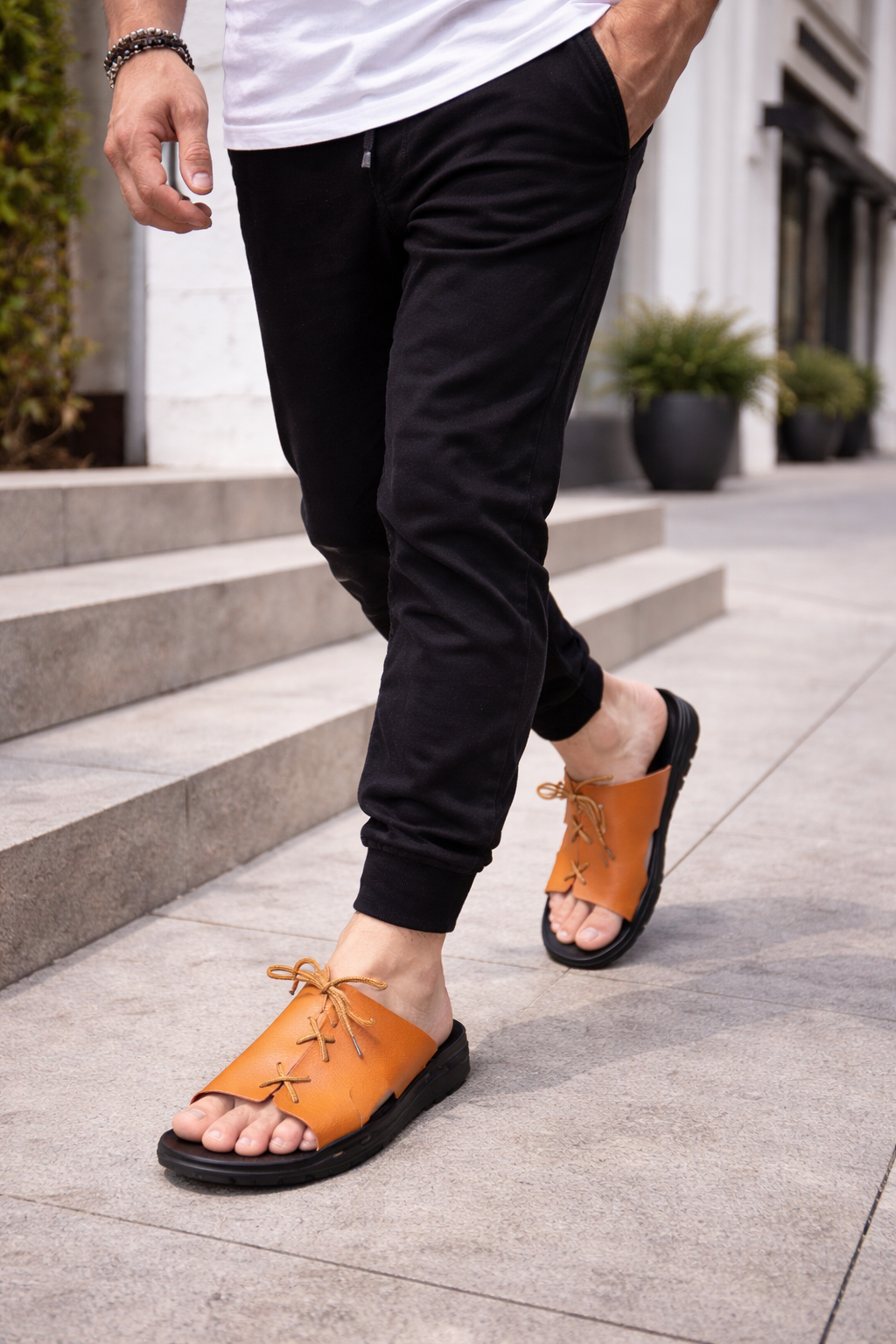 Men's Open Toe Slippers - Indoors Outdoors footwear - Slip on sliders - Orange / Tan color