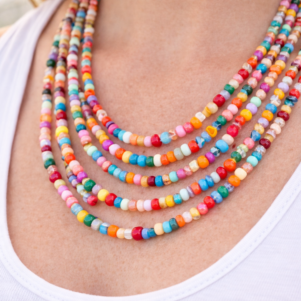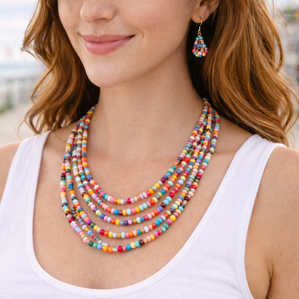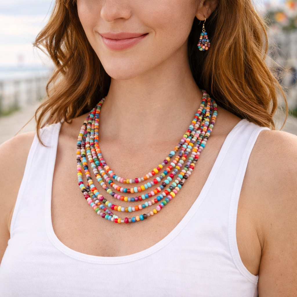 Bright, fun, and easy to style — this multicolor layered beaded necklace comes with matching earrings for a complete look. The colorful seed-bead design adds instant personality to tees, tanks, dresses, and festival outfits.