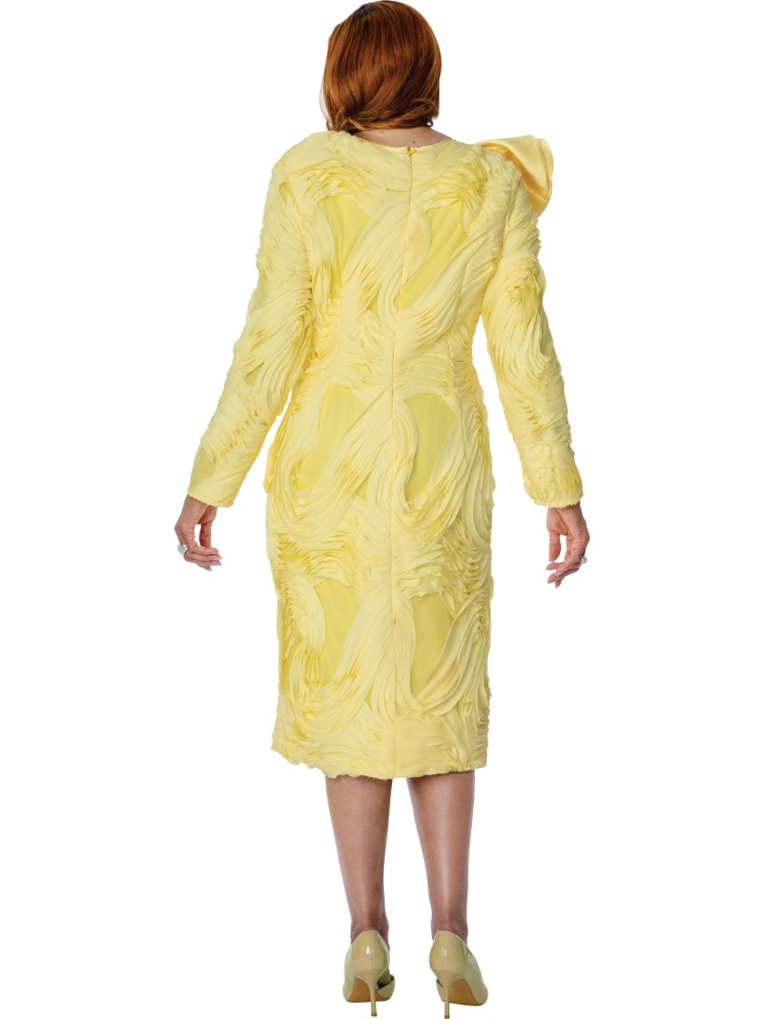 This DCC yellow dress is a standout statement piece, designed to turn heads at any special occasion. The dress features a sophisticated midi length with a modest round neckline and long sleeves for elegant coverage. A dramatic oversized layered ruffle detail at one shoulder adds high-fashion flair and creates a beautiful focal point. The body of the dress is crafted with intricate 3D swirl-textured fabric that gives depth, movement, and a luxurious designer look. Finished in a vibrant yellow shade and paired best with coordinating heels, this dress is perfect for church events, weddings, banquets, or any event where you want a polished, eye-catching appearance.