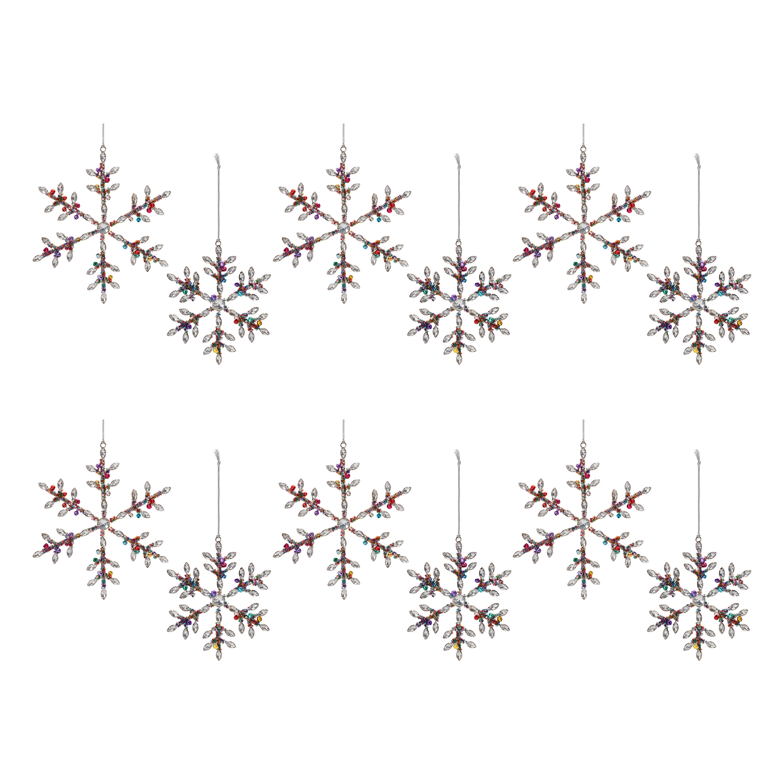 Celebrate the holiday season with this stunning set of Rainbow Beaded Snowflake Ornaments. Each ornament is adorned with a dazzling combination of silver and purple glass beads, adding a touch of elegance to your Christmas tree. Made from high-quality iron metal with a delicate glass composition, these ornaments are both durable and festive. The intricate snowflake design paired with vibrant multicolor accents ensures that your holiday decor will shine bright. Perfect for both residential and commercial displays, these ornaments are the ideal gift or home accent to bring festive cheer to any space. Sold in a set of twelve pieces with two assorted sizes to create a balanced display on your Christmas tree.