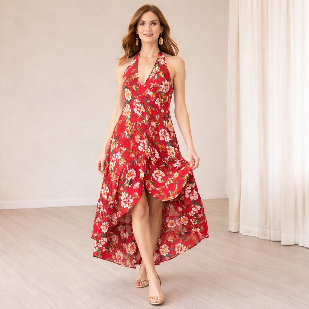 Floral Printed Halter Neck Red Dress