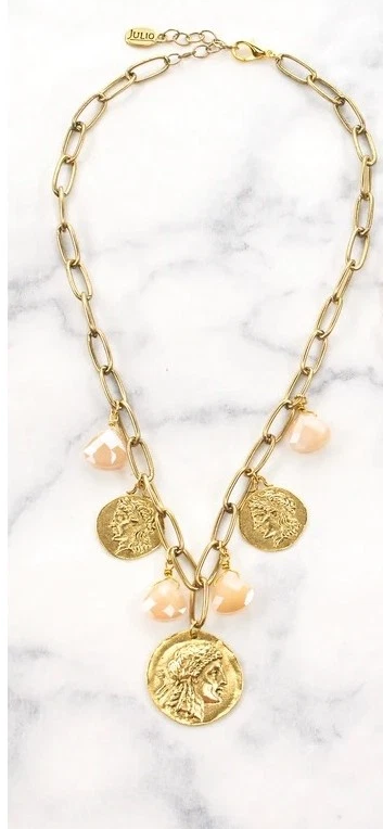 Add timeless style to your wardrobe with this striking necklace from Julio Designs. Featuring three Roman coin inspired pendants and sparkling crystal briolette accents on a stylish paperclip chain, this piece blends classic motifs with modern design.