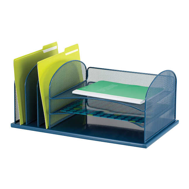 The Onyx wire mesh desktop organizer features 3 horizontal letter-sized trays and three 2 wide, upright file sections on the left. The durable steel mesh design aids in office supply organization and file storage.