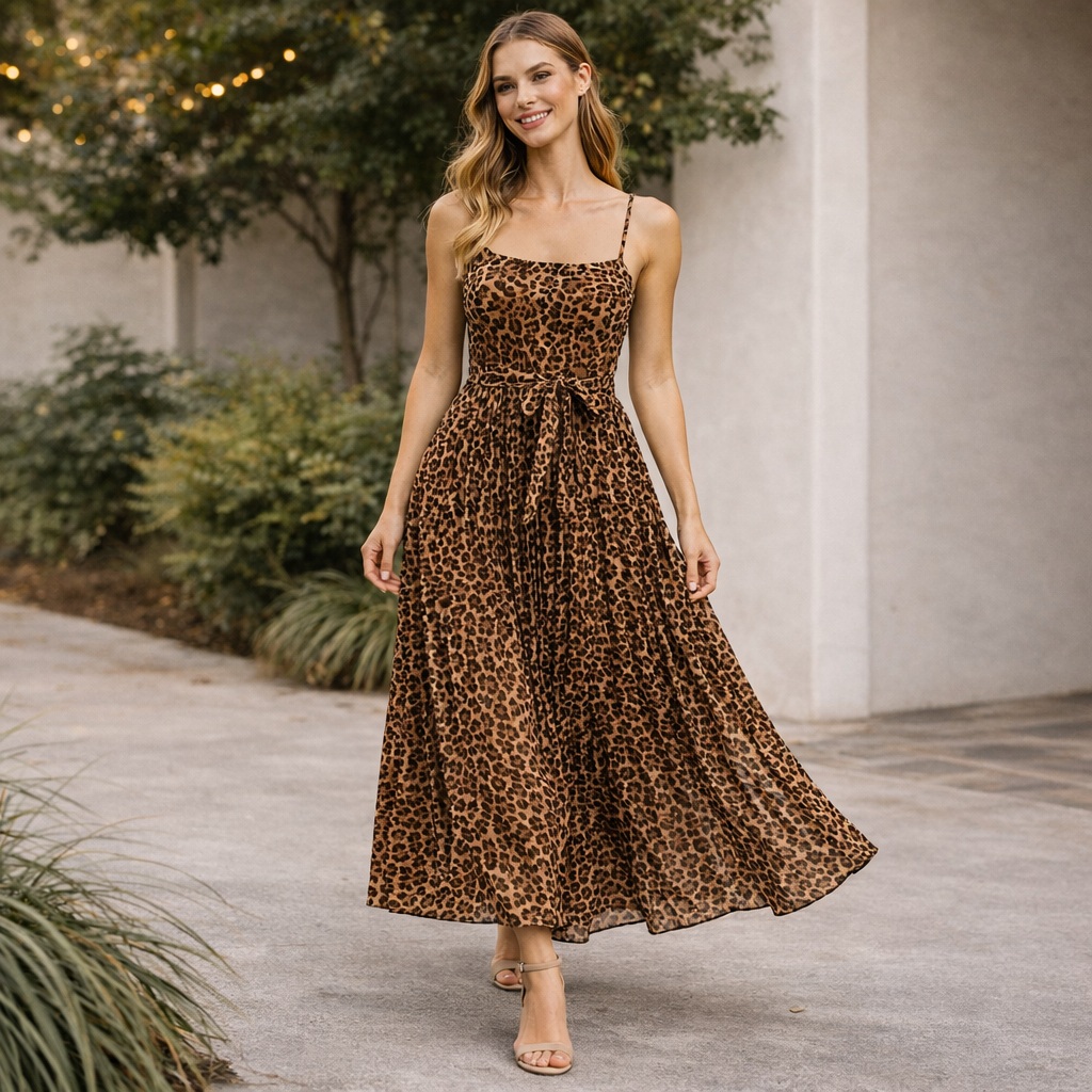 Spaghetti Strap Leopard Print Midi Dress - Pleated