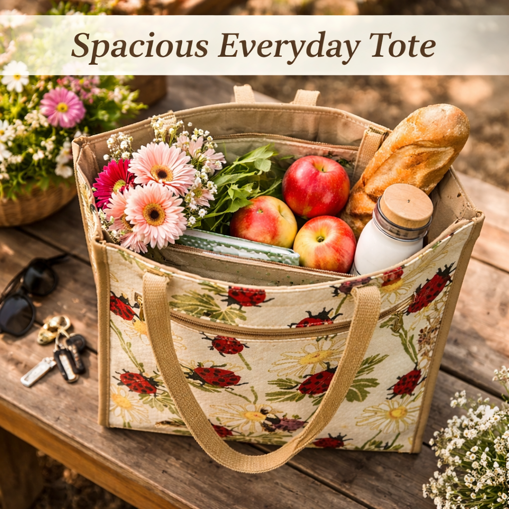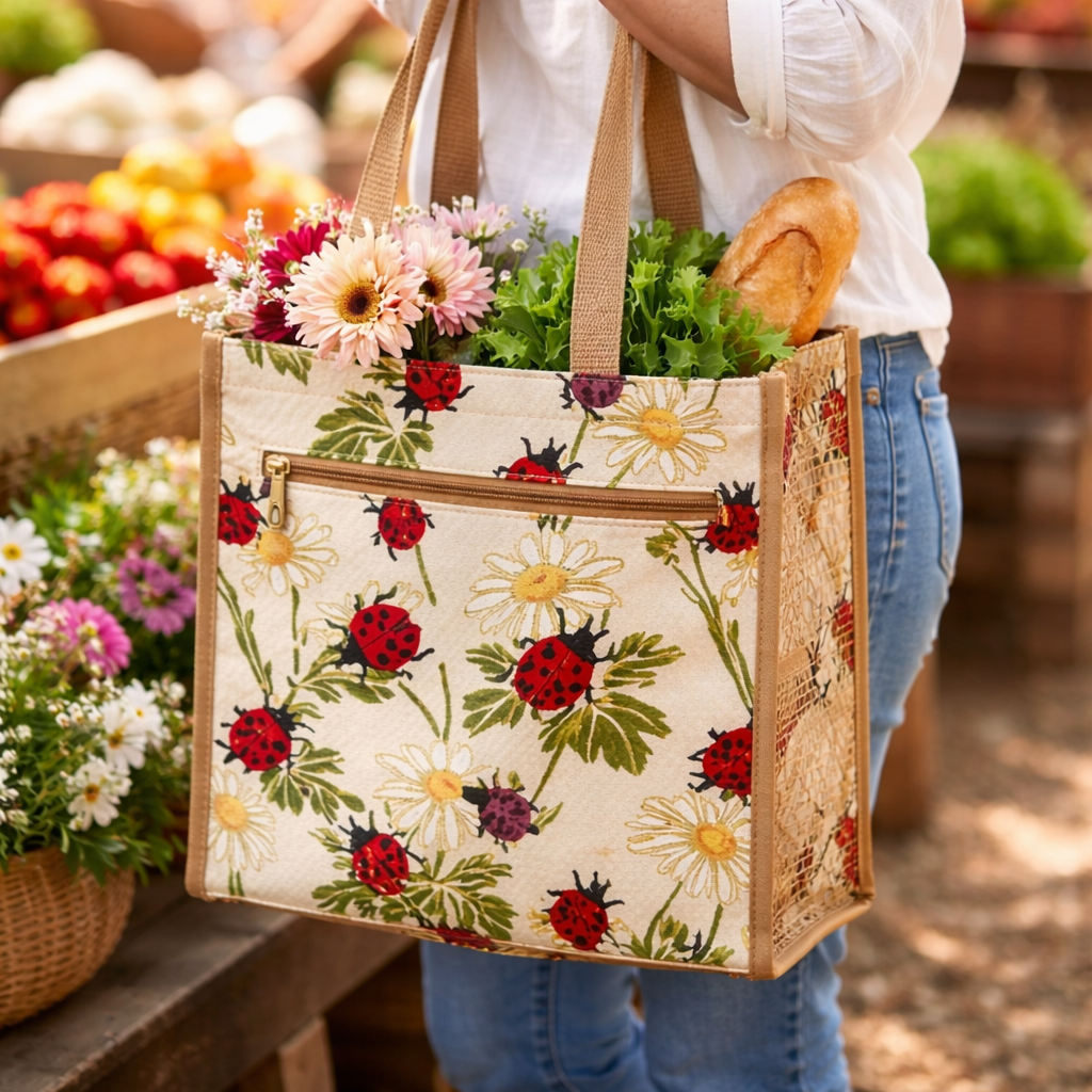 The Ladybug and Flower Pattern on the beige colored shopper bag looks absolutely stunning.
