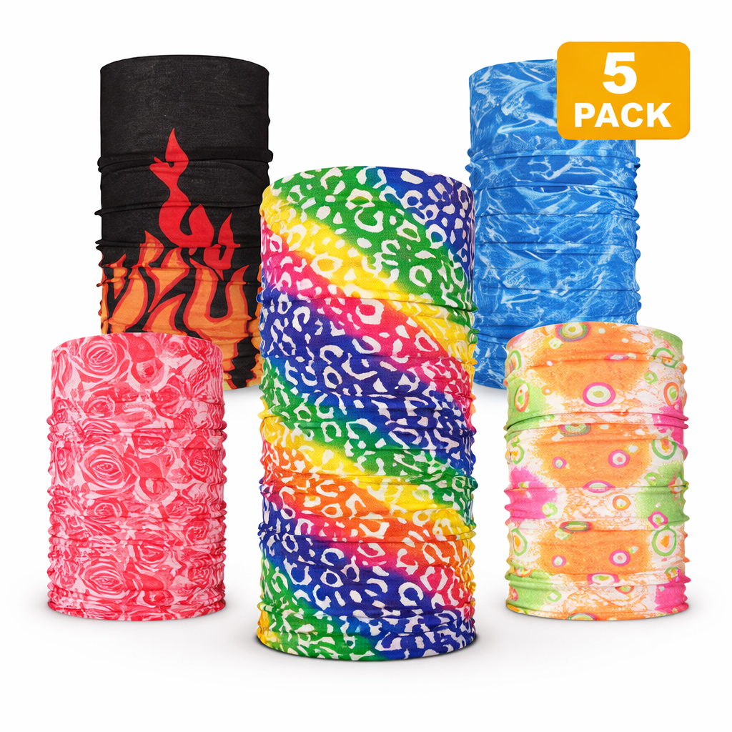 This 5 piece Tube Headband Set can be worn as a colorful and fashionable face mask for protection against germs, dust and pollution, as protection from harsh wind and road grit if you are a biker or runner. It also protects you against mosquitoes and bugs - useful for fishermen. Stop that cold draft down your back when you layer this between jacket collar and nape of neck! Light and comfortable, featuring five unique designs. Wear under your helmet for warmth during cold rides.