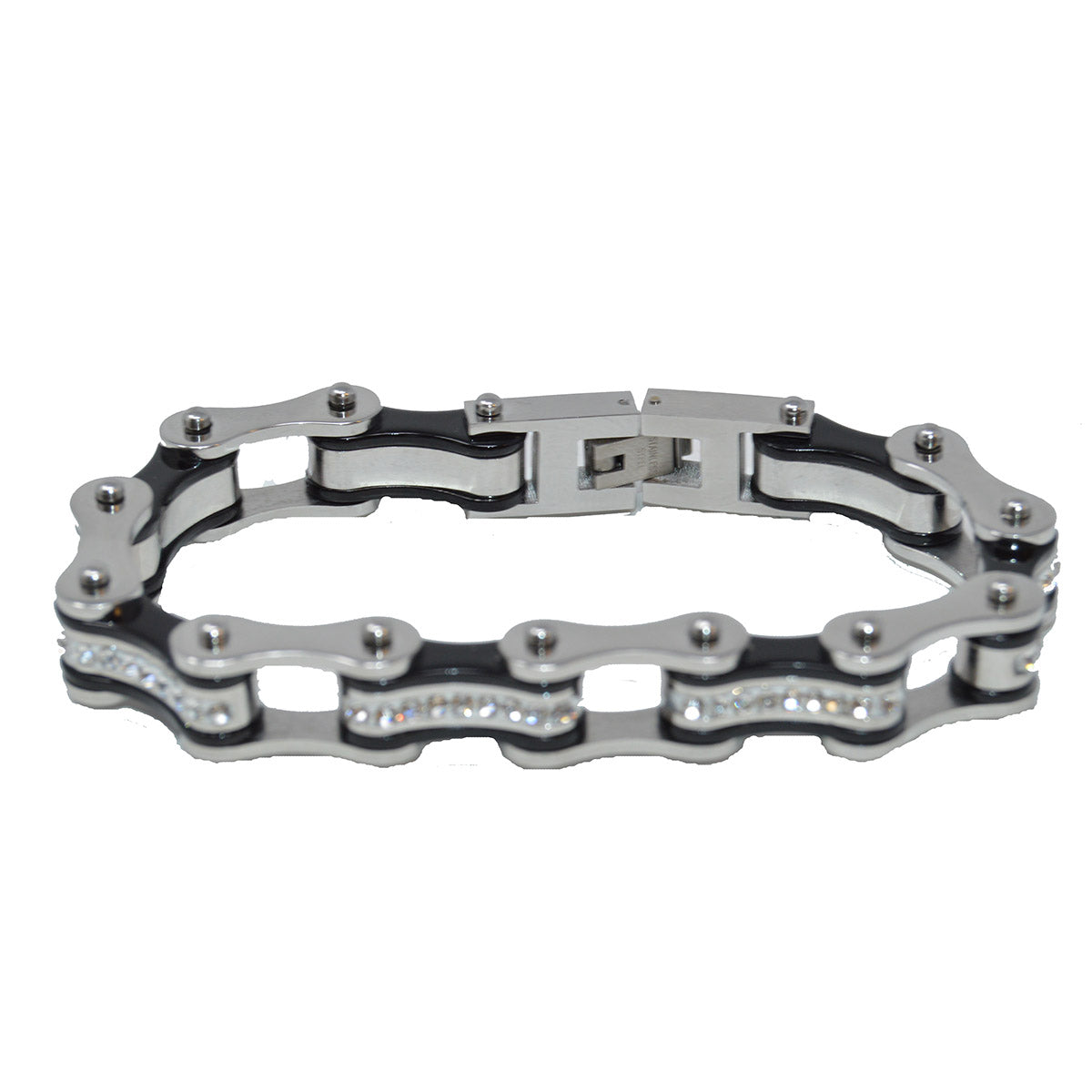 Two Tone Silver and Black Bike Chain Bracelet with White Crystal Centers