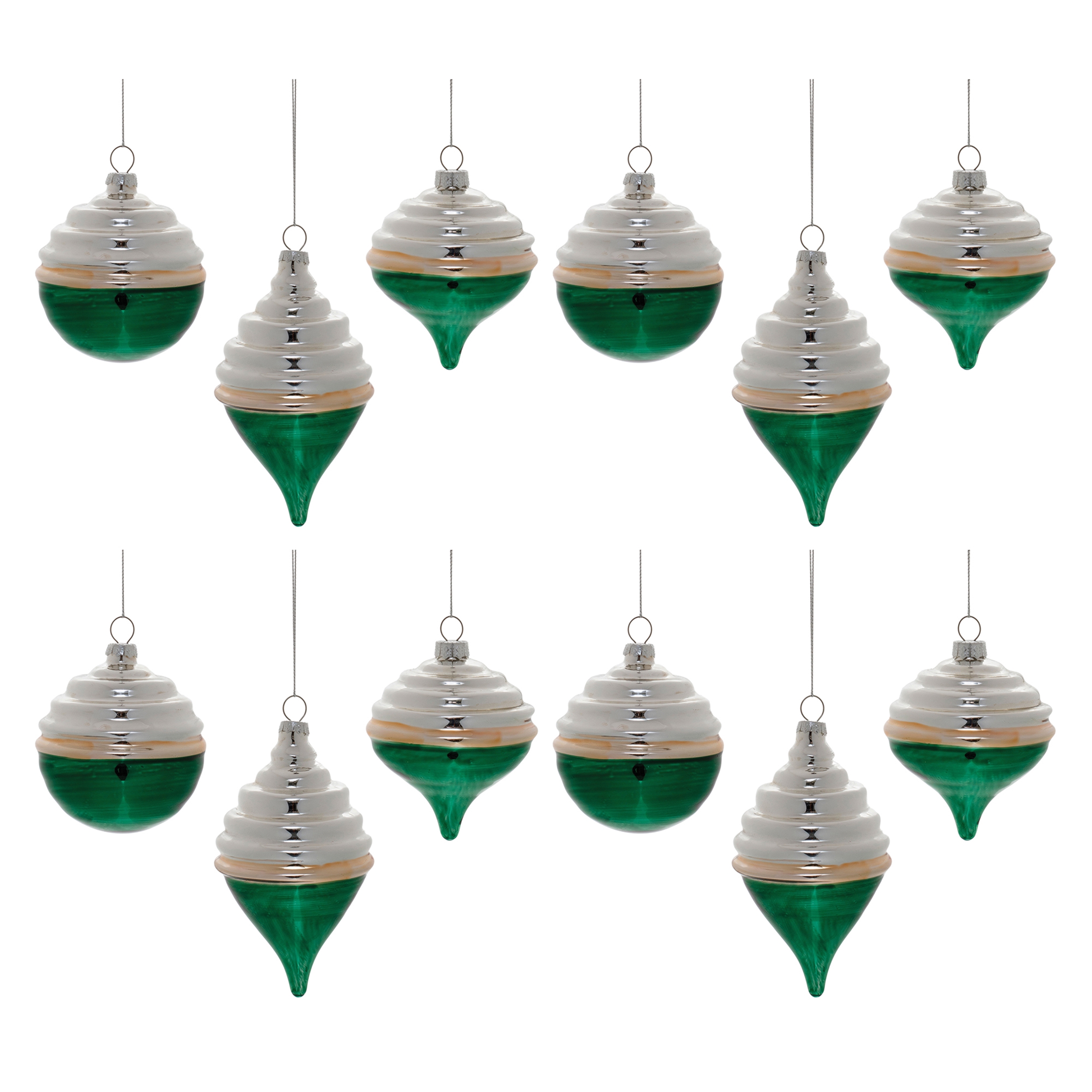 Elevate your Christmas tree this season with the elegance of our Two-Tone Tiered Glass Ornaments. This collection includes three distinct designs, featuring a harmonious blend of wintry green and silver tones. Crafted from high-quality glass and adorned with a delicate silver string hanger, these ornaments offer a touch of sophistication and festive charm. Perfect for decorating your home or as a thoughtful holiday gift, they are sure to bring joy and sparkle to any occasion. Make your holiday season unforgettable with these stunning glass ornaments. Sold in a set of twelve pieces with three assorted designs to create a balanced display on your Christmas tree.