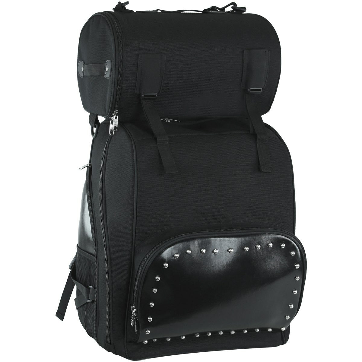 The VS1354 sissy bar bag from Vance Leather is composed of a textile and leather-like combination of materials, merging the two worlds of function and style. This bag will fit most bikes with a 10" backrest or smaller. It comes with an additional roll bag that can be strapped on top and secured with included straps for those slightly longer road trips. Vance Leather has all your motorcycle luggage and bag needs covered. Check out all our other styles if this one doesn t suit your fancy. The VS1354 is offered in both plain and studded sissy bar bag options.