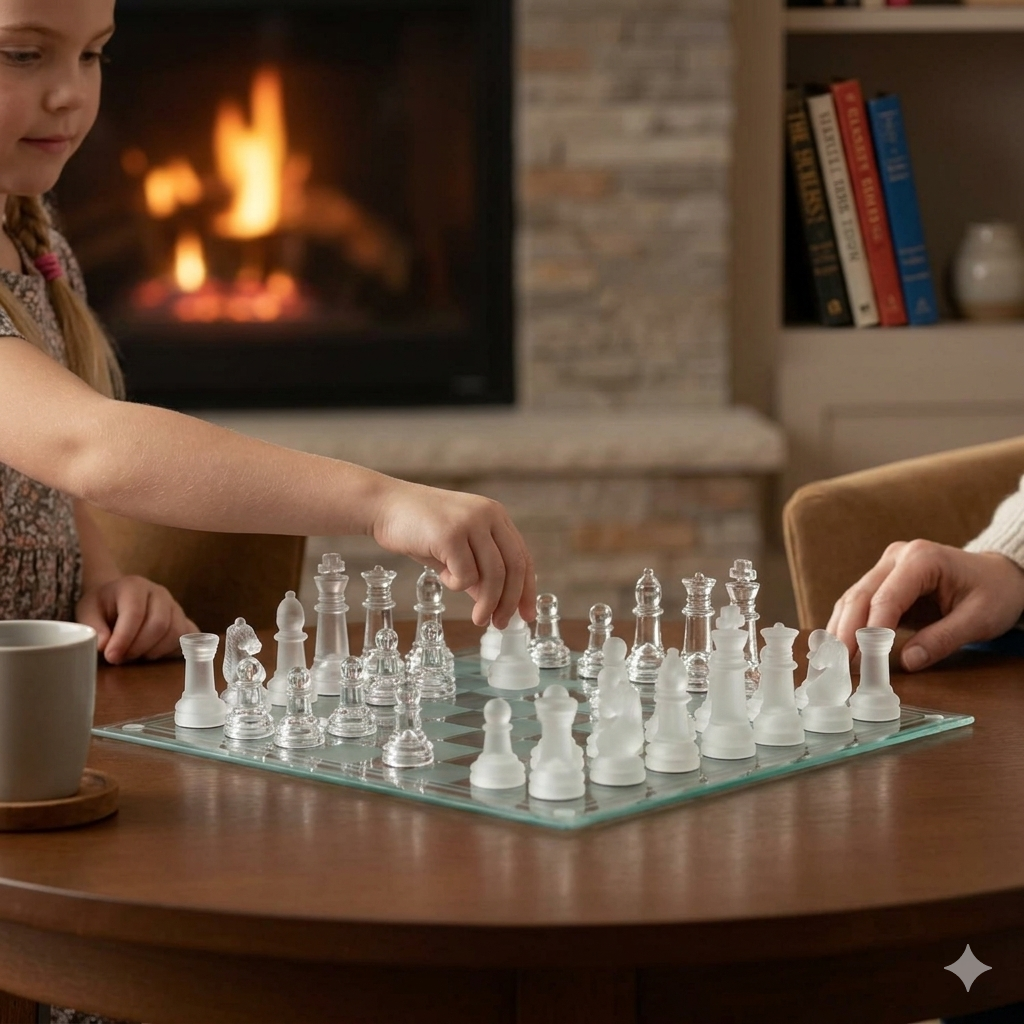- Features glass game board