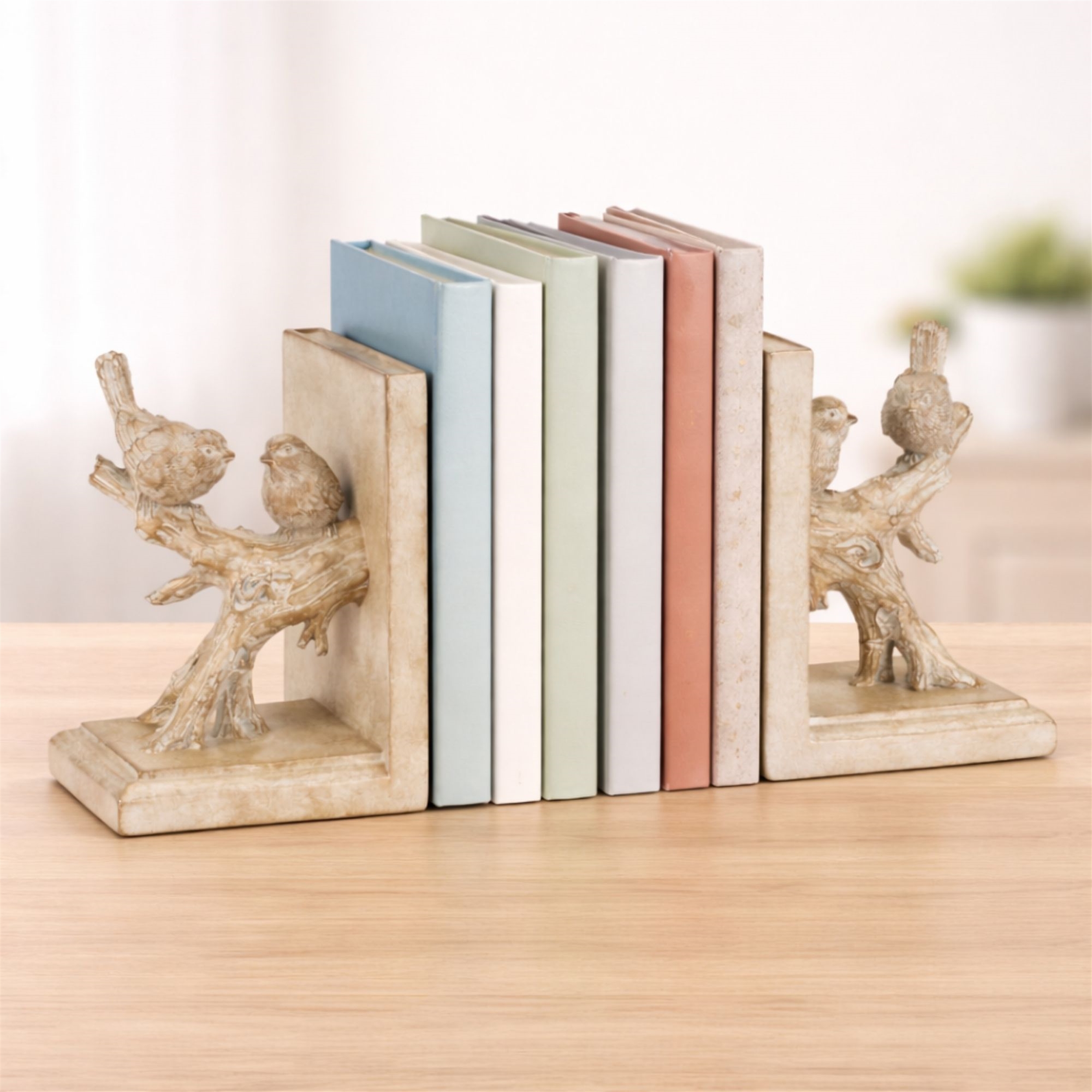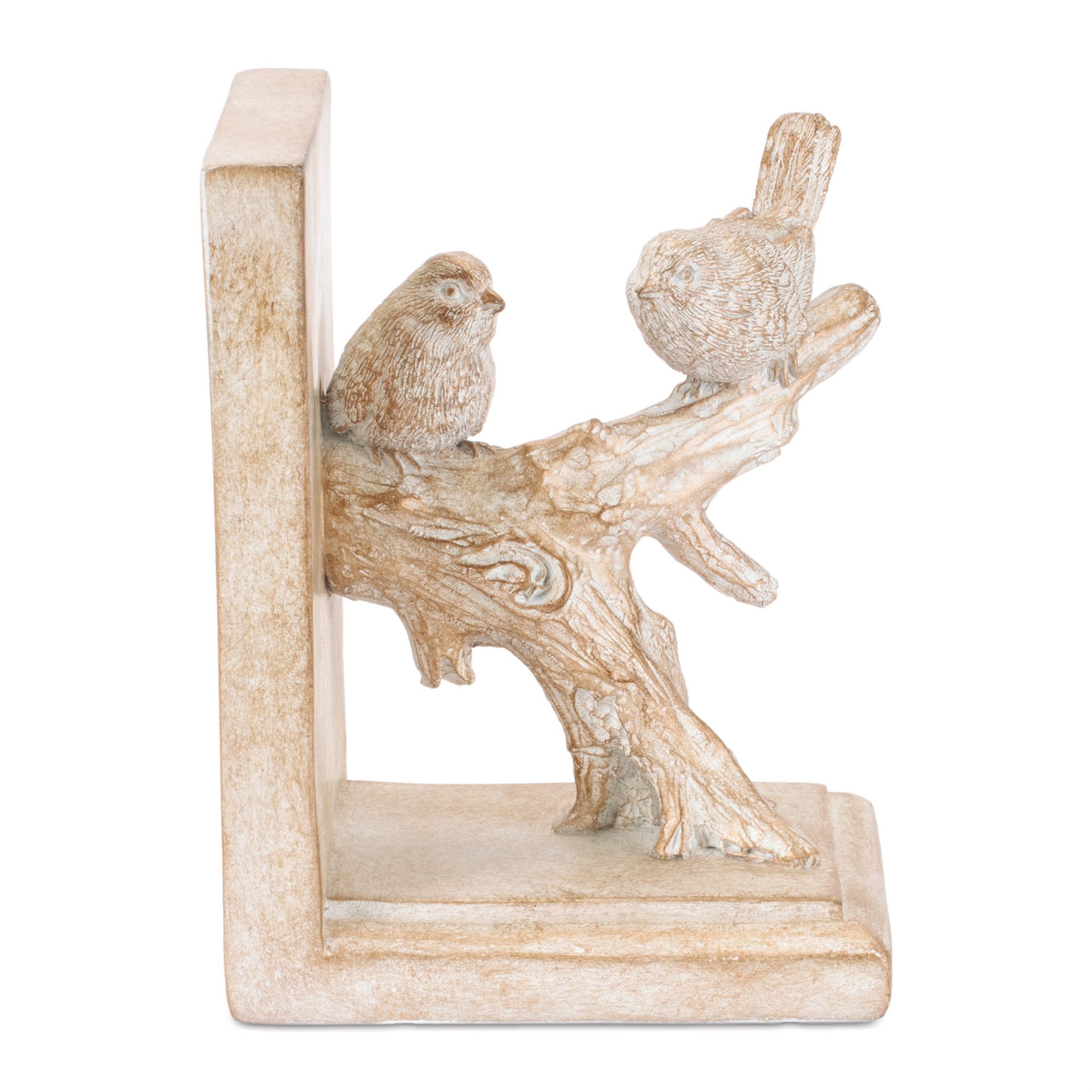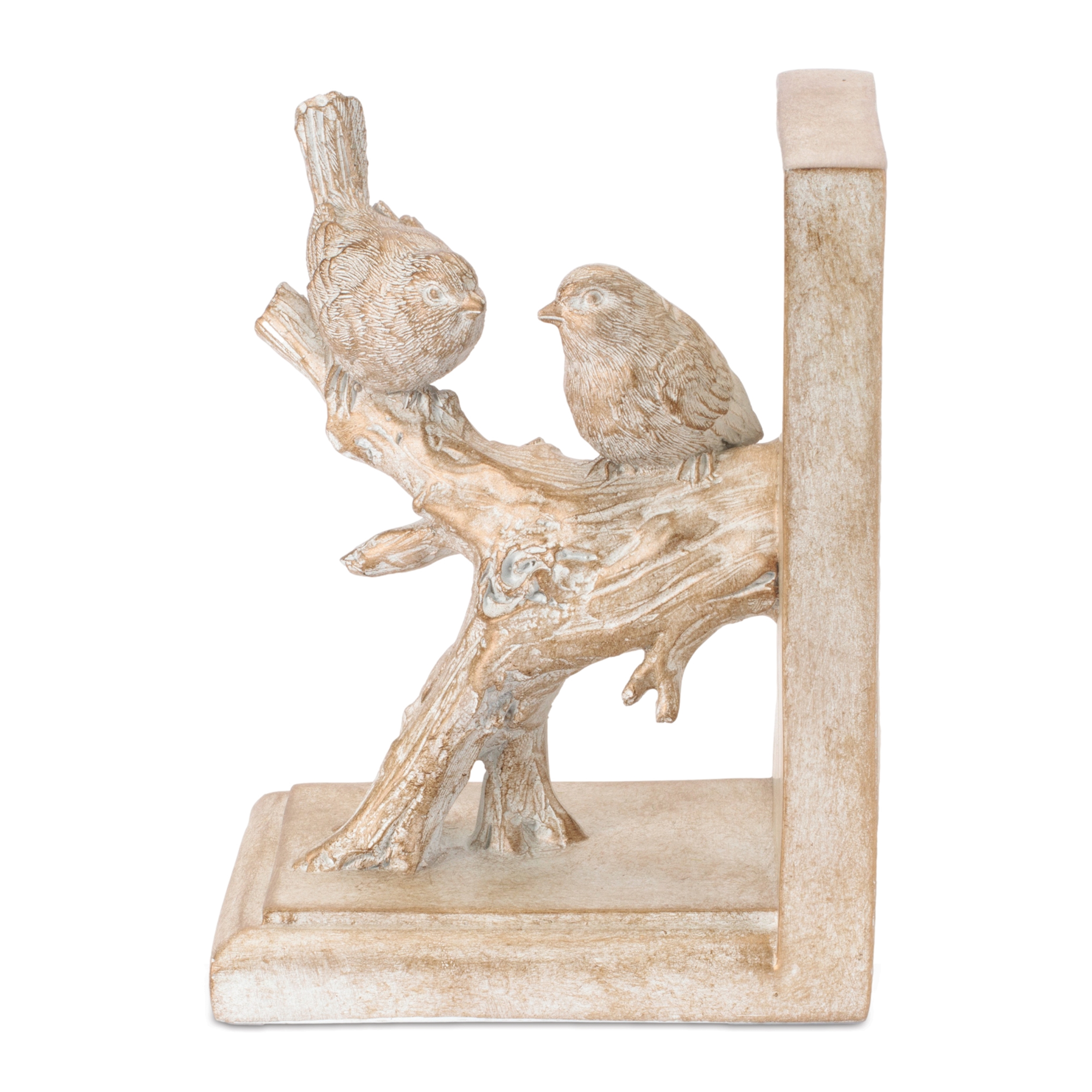Add a warm, nature-inspired accent to your shelving with this bird on branch bookend set, featuring delicately sculpted birds perched along a textured tree branch. Finished in soft neutral tones with subtle distressing, each piece offers a rustic yet refined look that blends effortlessly with a variety of decor styles. The detailed carving and organic design bring a touch of the outdoors inside, making these bookends both functional and decorative for shelves, desks, or mantels.