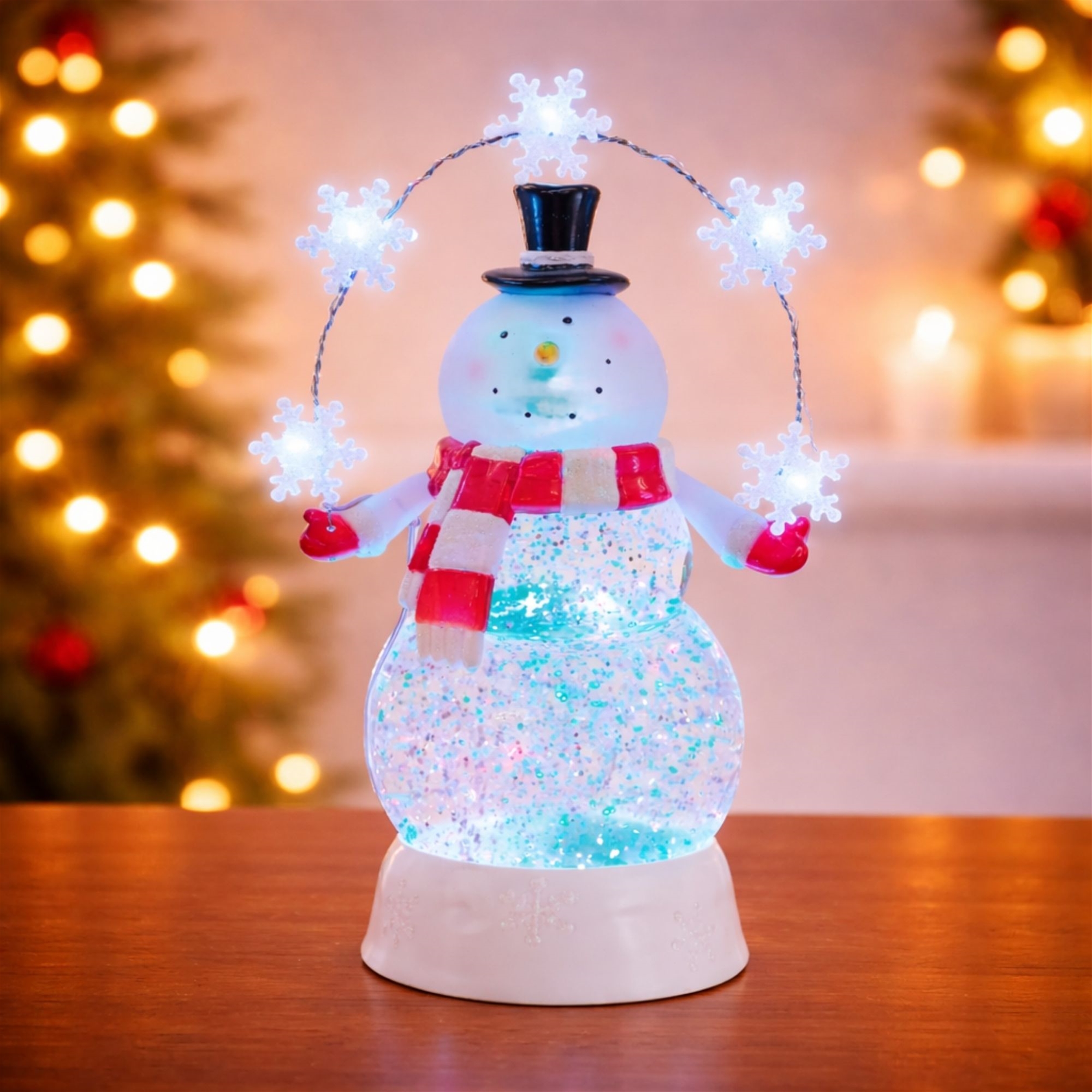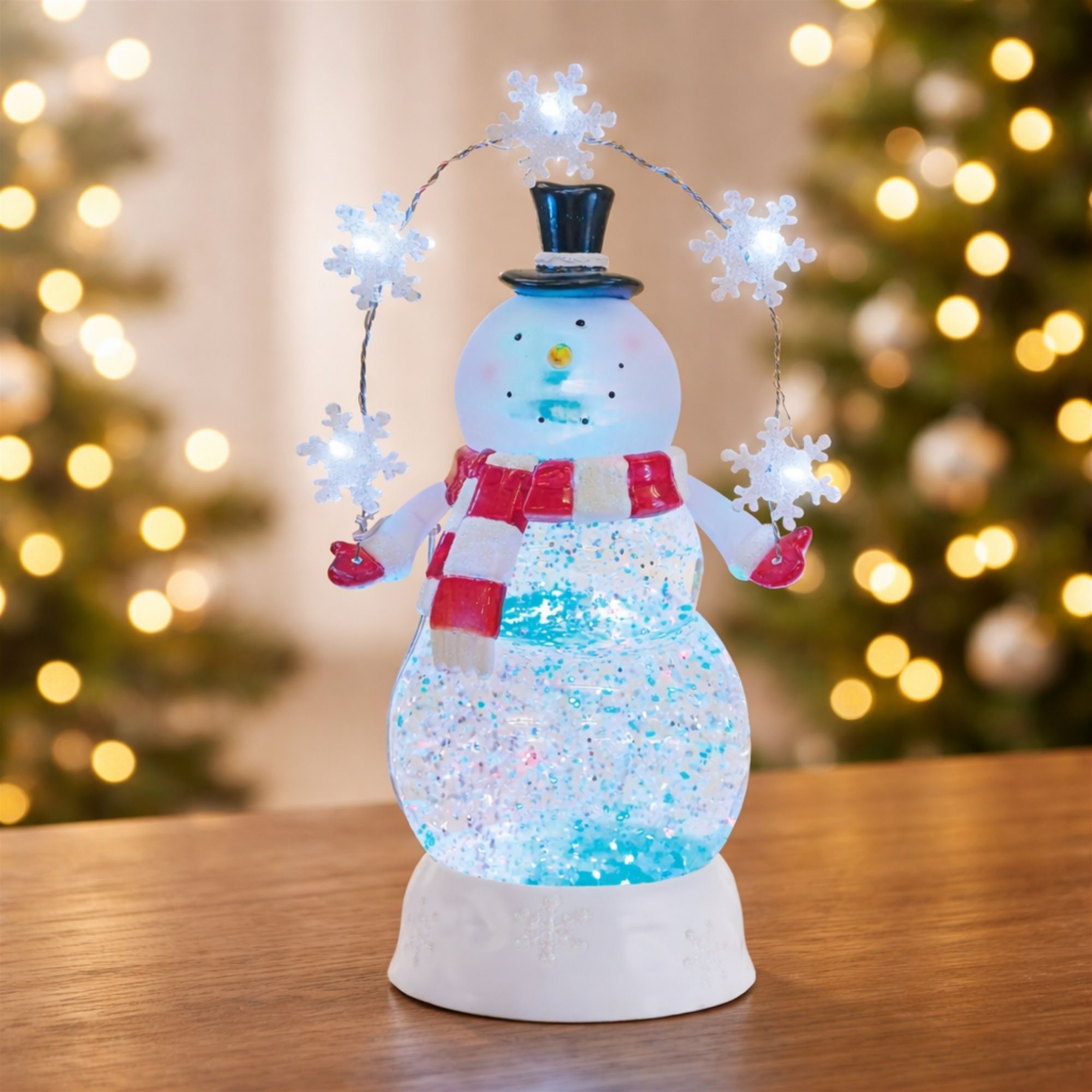Add a touch of wintry magic to your holiday d cor with this charming LED Snowman Powered Snow Globe. Featuring a cheerful snowman dressed in a festive scarf and top hat, this lighted snow globe sparkles with swirling glitter and cool blue LED illumination that brings the scene to life. Perfect for tabletops, mantels, office desks, or entryway displays, this battery-operated snow globe creates a cozy, festive ambiance anywhere you place it no cords required. The classic snowman design paired with shimmering movement makes it a delightful accent for Christmas decorating, winter parties, or seasonal gifting. Whether styled as part of a larger holiday village or displayed on its own, this illuminated snow globe adds nostalgic charm and glowing holiday spirit to any space.