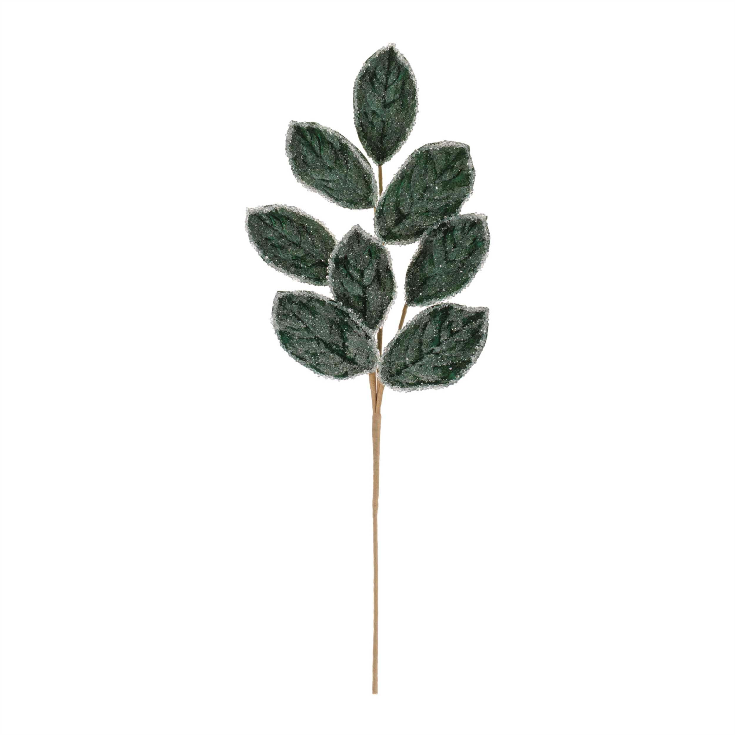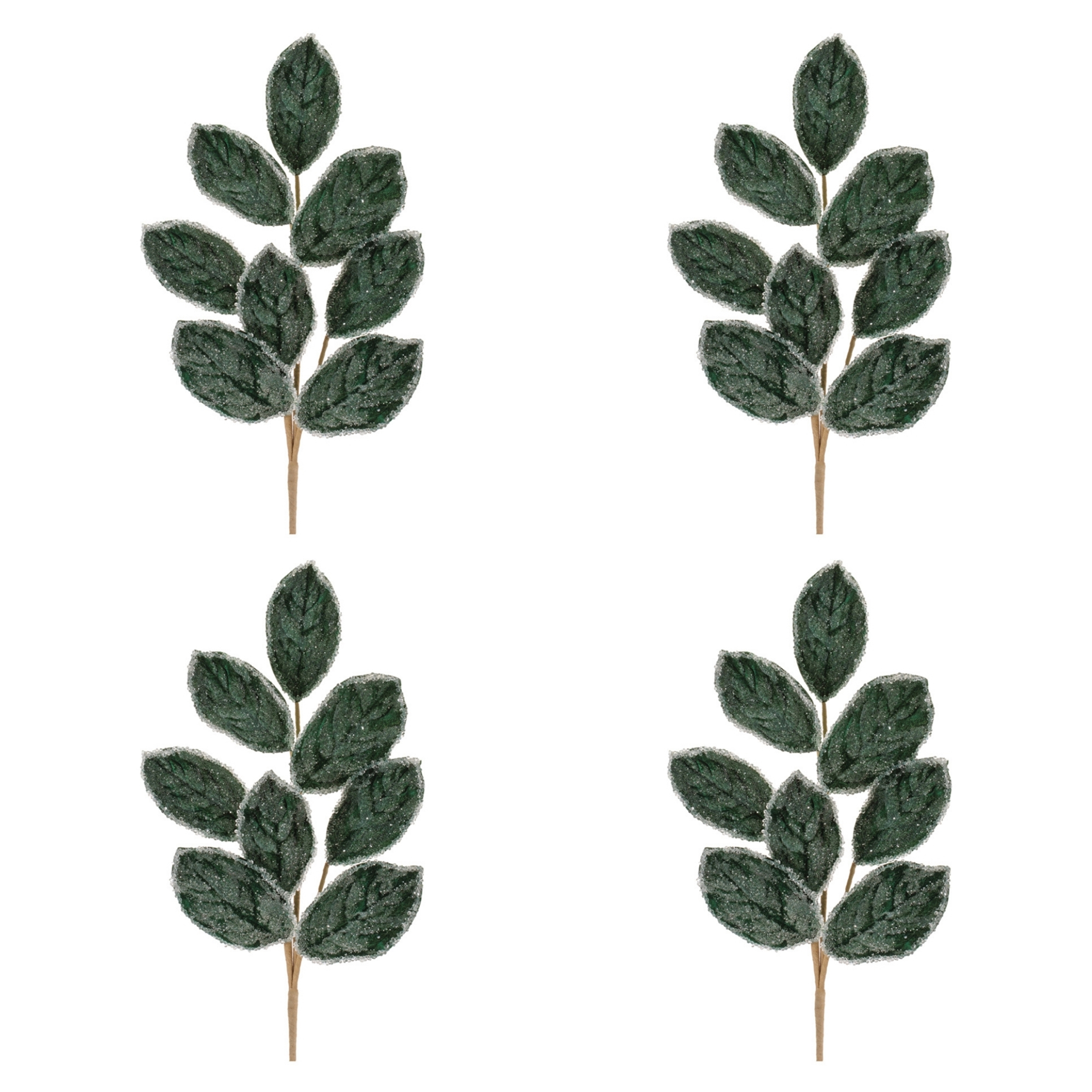 - Set of four magnolia leaf sprays with detailed veining and frosted, glittered edging for added sparkle