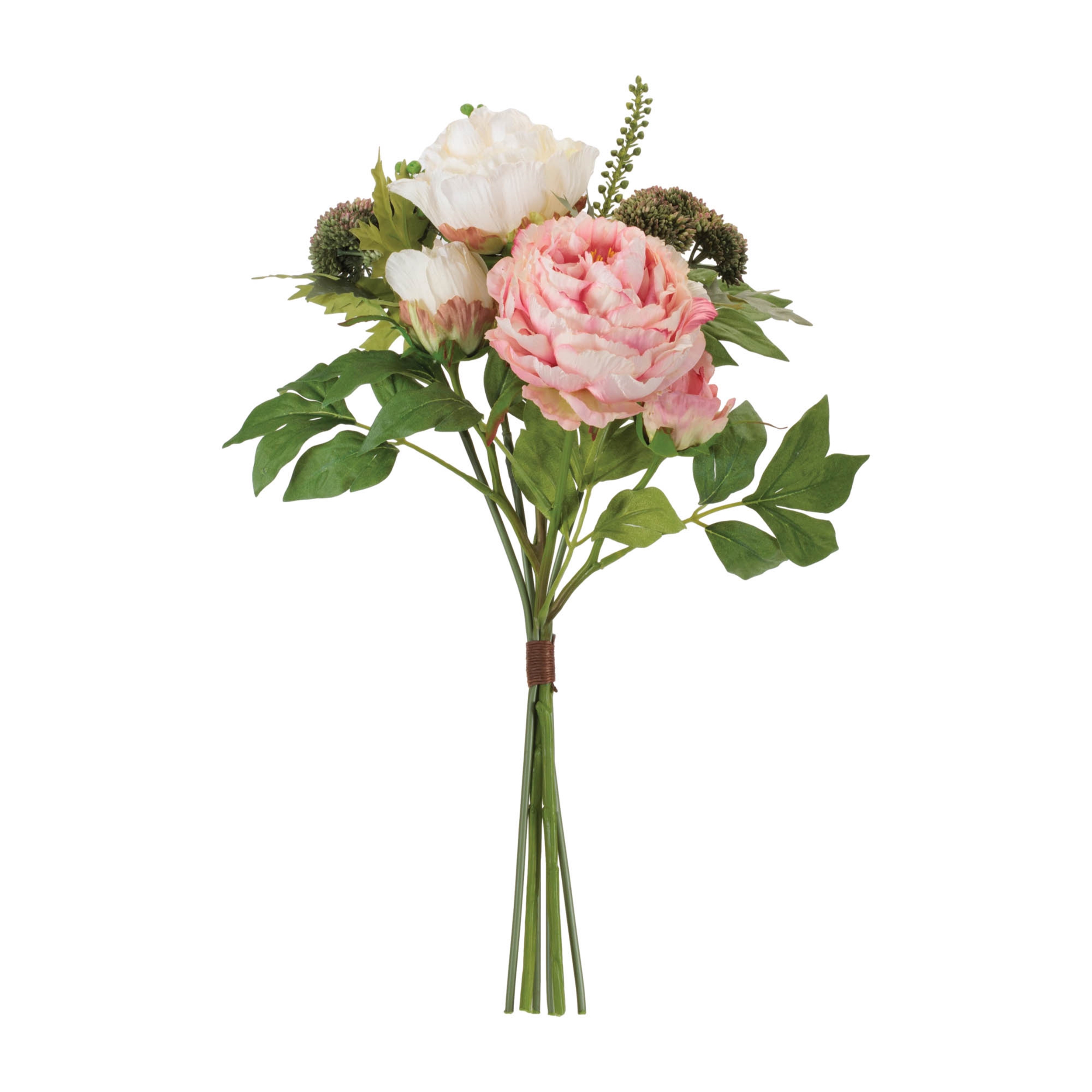 - Lifelike pink and cream peony blooms with layered petals and natural greenery accents