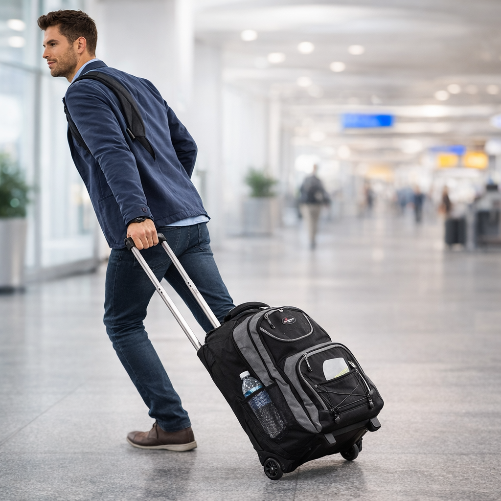 Wheels/Rolling, Adjustable Straps, Backpack Straps, Carry On, Laptop Compartment, Water Bottle Pocket