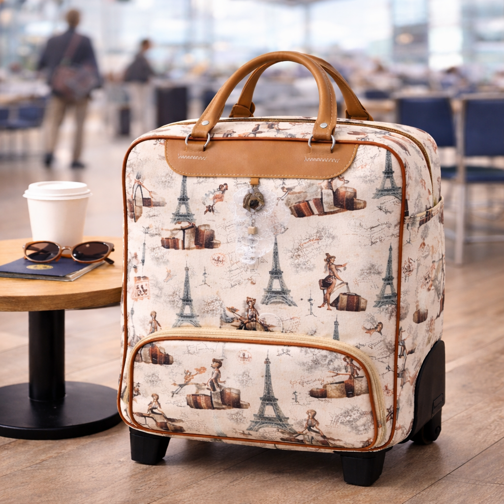 A compact, stylish rolling carry-on designed for weekend trips, short getaways, and light travel. Featuring beautiful Paris scenes, this softside suitcase combines personality with practical travel functionality.