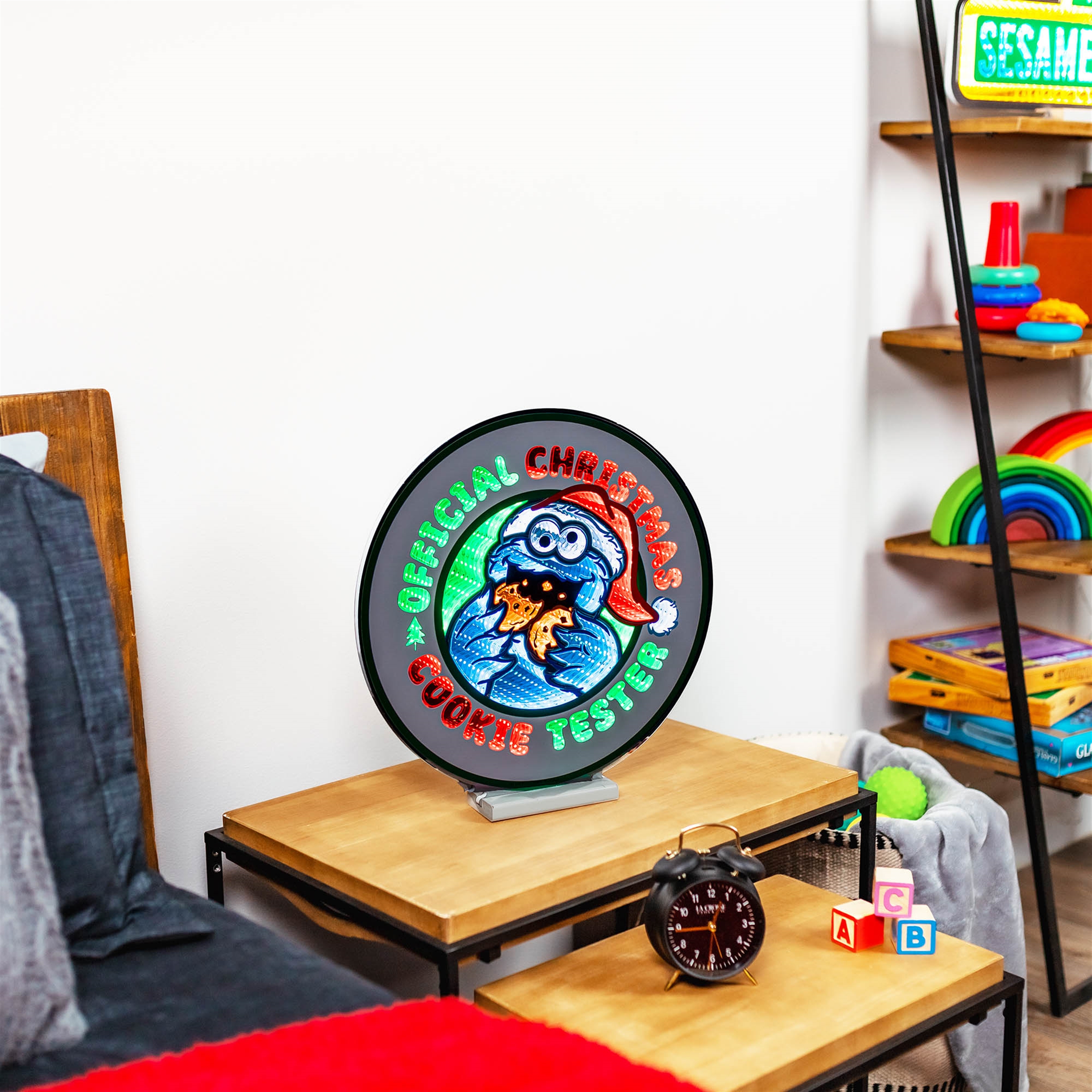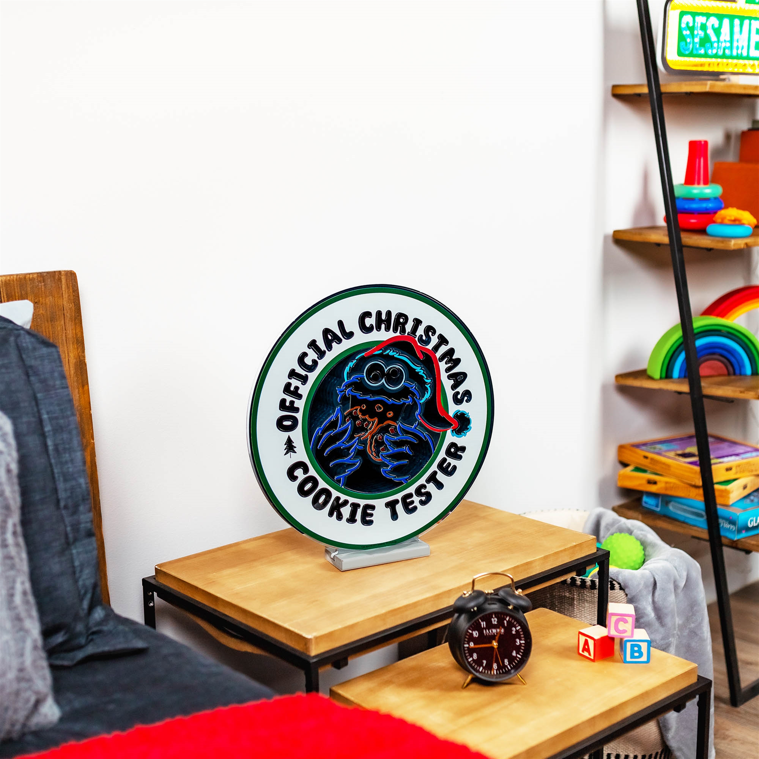 Get ready for a cookie-filled holiday with the Sesame Street Holiday Cookie Sign Ekkolight! Featuring Cookie Monster happily munching on his favorite treat, surrounded by the playful phrase "Official Christmas Cookie Tester", this LED light shines in festive red and green tones, bringing a fun, holiday spirit to your decor. Perfect for kids' rooms, play spaces, or kitchen holiday decor, this playful and heartwarming design is sure to brighten up your seasonal decor spaces. Created in colaboration with Sesame Street, let Cookie Monster brighten up your holidays with his big smile and boundless energy!