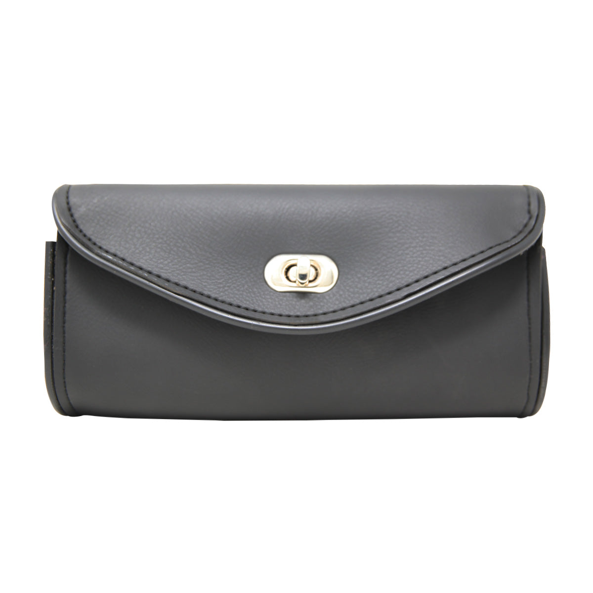 This windshield bag is unadorned, and has a secure turn knob to close the flap. PVC construction and a metal plate on the back for easy attachment to the bike. This opens to about 1 1/2 inches.