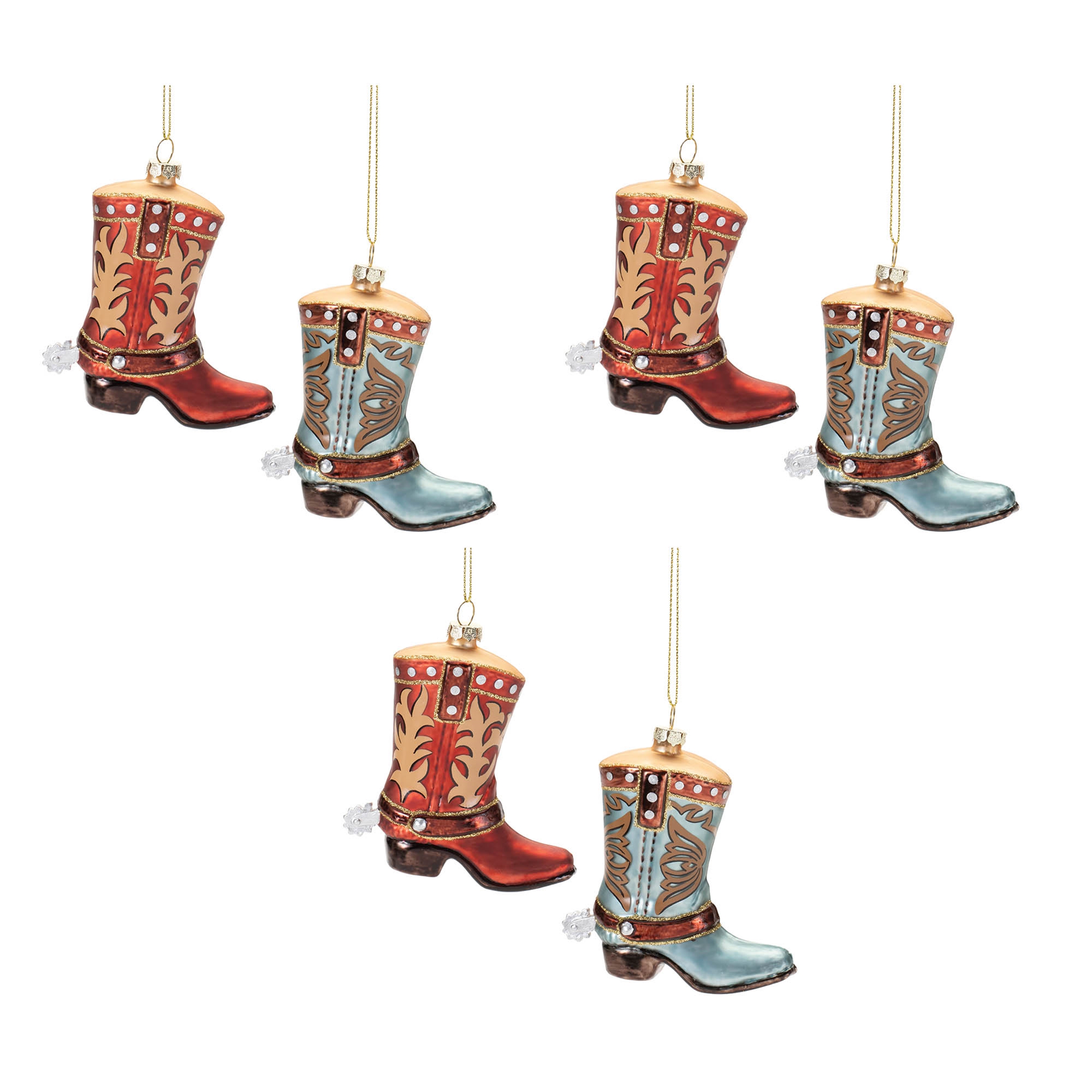 Bring a touch of the Wild West to your holiday decor with the Glass Cowboy Boot Ornament. Featuring wintry blue and red tones with glittered touches, these ornaments showcase a Western cowboy boot design, making them a perfect addition to any rustic or Western-themed Christmas tree. The set includes six pieces with two assorted designs, each with a delicate string hanger and a champagne ornament cap for easy hanging. Whether displayed on your tree, front door wreath, or mantle garland, these ornaments add a fun and festive flair to your holiday display.