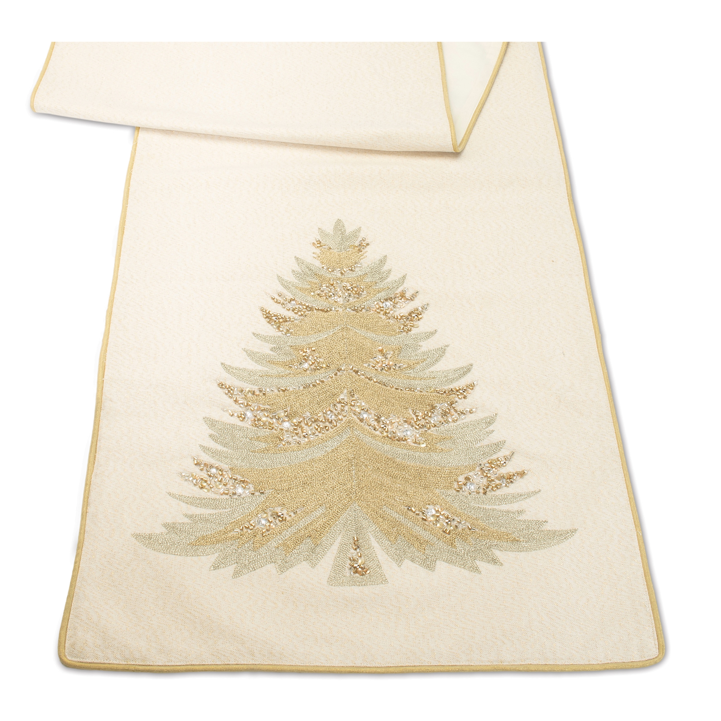 Celebrate the holiday season with the Bead Embroidered Pine Tree Table Runner. Featuring wintry beige and gold tones, this elegant table runner showcases an embroidered pine tree design with delicate bead accents for added texture and sparkle. The cotton top and polyester backing provide a durable yet refined feel. Perfect for the center of your dining table when entertaining guests on Christmas Day, or as a stylish accent piece on your entryway table beneath a holiday display.