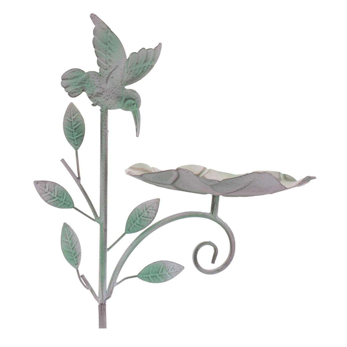 Bring a graceful, nature-inspired look to your outdoor space with this Set of Iron Hummingbird Leaf Bird Feeder Garden Stakes. Each 44-inch stake features a delicately shaped leaf bowl in soft green and grey tones, topped with a charming hummingbird accent. With a weathered finish and artistic detail, this set of two feeders are perfect for inviting birds to your garden while adding a serene, decorative touch.
