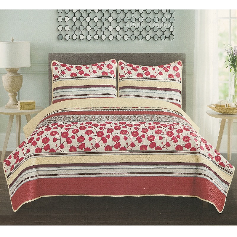 3 Piece Quilted Bedspread SetPoppy Flowers and MultiColor StripesFull/Queen and King Size |