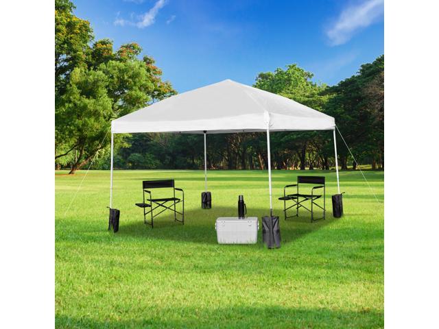 Don't let the blistering sun or a rainy day spoil your outdoor activities and events. This white all-weather pop up canopy tent will keep you out of the elements so you can enjoy your time with family and friends. The polyester top is weather resistant to keep you dry in light rain, has reinforced corners to prevent ripping or tearing and is UV coated to resist the sun's rays to prevent fading. Simply unfold the fabric top, attach to the frame with the hook and loop fasteners, extend the bottom legs and pull open for instant protection. Get many years of enjoyment from this canopy tent. The white steel powder coated frame is rust and corrosion resistant and locks in place with a pinch free locking mechanism. The height adjustable frame takes you from the backyard to the beach and everywhere in between. Secure the included weight bags to the bottom legs then fill with sand (not included) to ensure maximum stability. This canopy pop up tent folds up when not in use and has its own wheeled case for easy transport and storage. This quick shade canopy includes the frame, canopy top, stabilizing ground stakes, weight bags and a wheeled storage case. Assembly takes less than 10 minutes and does not require tools. Take this portable shade canopy on camping trips, tailgating, the kids soccer games or for get togethers on your patio or in the yard. This party canopy tent will look great season after season.