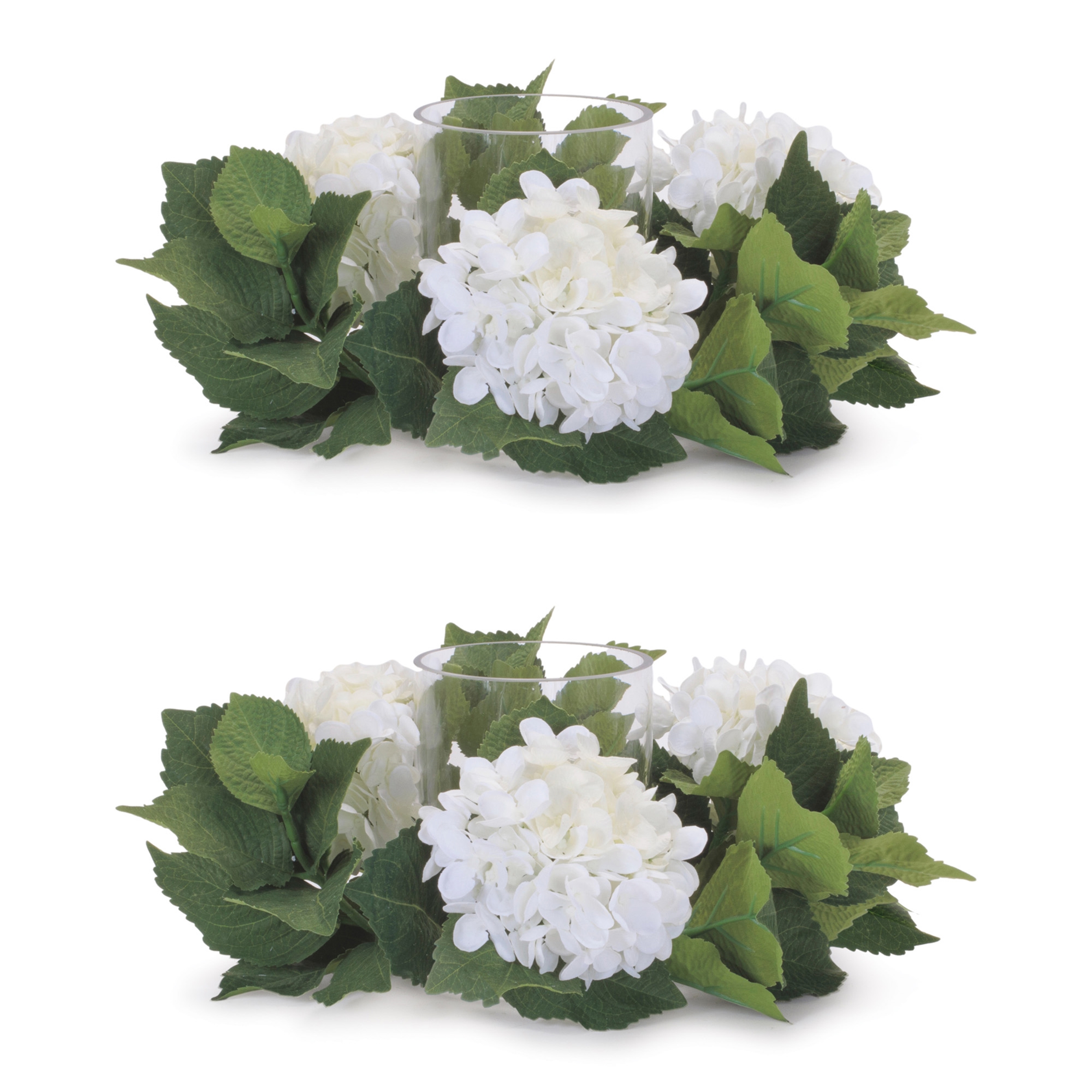 Bring a touch of nature to your decor with this set of two Hydrangea Floral Candle Rings. Featuring soft white floral tones and natural green foliage, these candle rings are designed with delicate hydrangea flowers and a chic glass hurricane insert. The wired base and stems offer sturdy and versatile placement for a 4" pillar candle (not included). Perfect for coffee tables, end tables, or dining room centerpieces, these candle holders add a pop of natural color and can be paired with a natural or LED candle to create a warm, inviting glow.