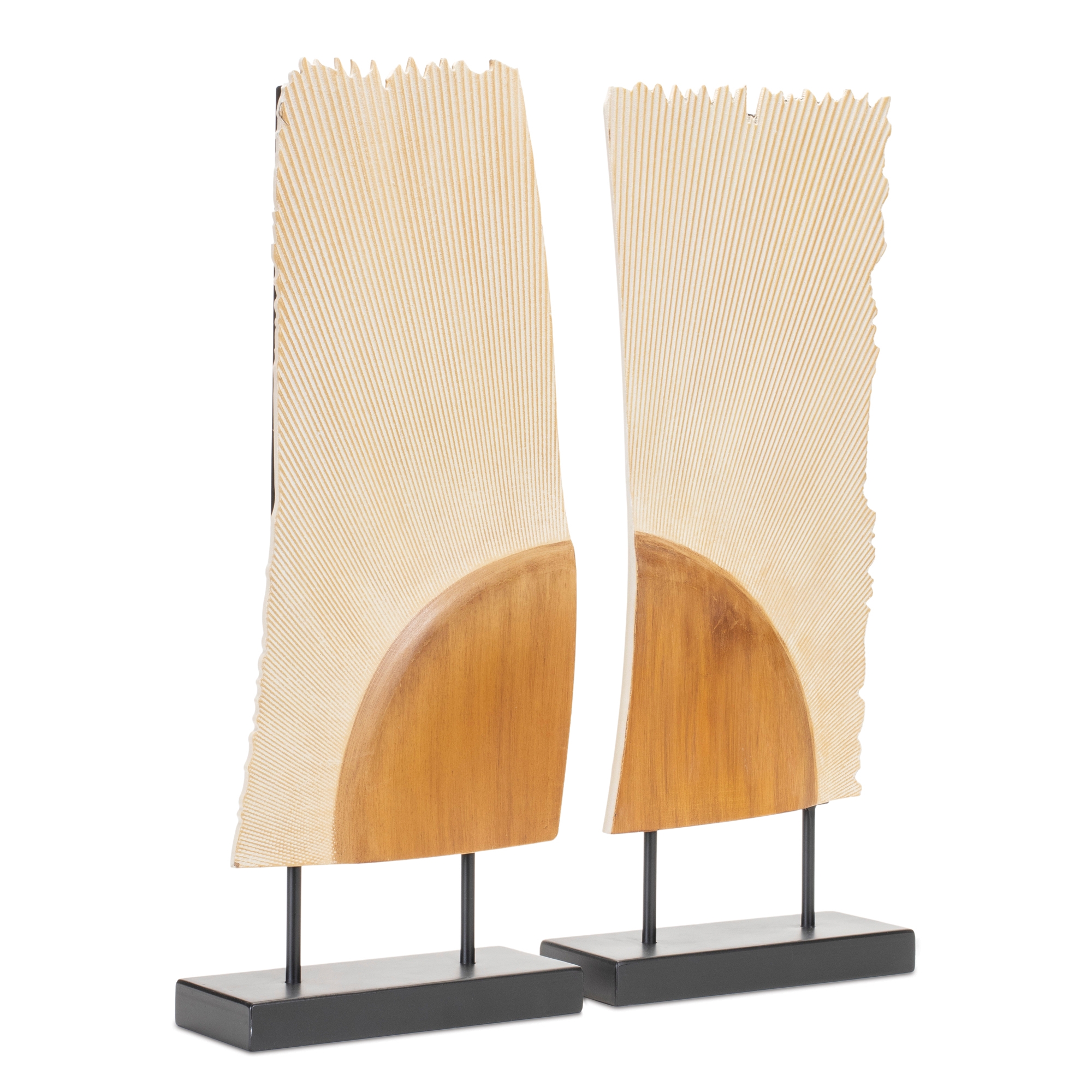 Sculptural and striking, this set of two tabletop accents blends organic warmth with modern artistry. Crafted from wood with fine linear detailing and mounted on sleek iron bases, each piece captures movement and form, like rays of sunlight breaking across a horizon. Tall and elegant, they make a bold statement on consoles, shelves, or dining room buffets, adding height, texture, and an artistic edge to your d cor.